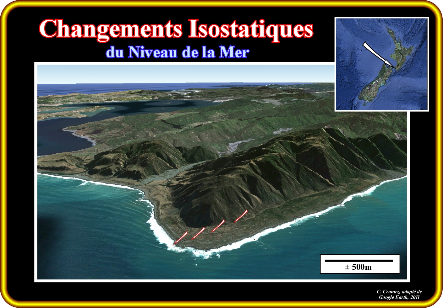 Le manteau de la Terre s'écoule latéralement, encore aujourd'hui, pour remplir les zones sous les endroits où les plaques de glace, épaisses et lourdes, l'ont l'obligé à s'enfoncer, il y a environ 18000 ans. Dans cette vue du littoral sud de île nord de la Nouvelle Zélande, les changements isostatique niveau de la mer, induits par le soulèvement isostatique peuvent être facilement reconstruits à partir des anciennes plages, qui ont été, successivement, soulevés et que, dans la réalité, correspondent à des lignes de côte fossiles. En outre, dans le nord de l'Europe, le soulèvement ou saut isostatique est facilement reconnaissable, non seulement au Groenland, mais aussi sur la côte de la Norvège, où la surface de presque toutes les fermes a augmenté depuis la première enquête du cadastre officiel faite au XVIème siècle. Le soulèvement isostatique est, parfaitement, corroboré par toutes les données sismiques de l'offshore de la Norvège. En fait, près de la côte, toutes les lignes sismiques montrent une nette troncature des horizons antérieurs à la déglaciation quaternaire. Ceci a, évidement, des implications importantes dans l'évaluation du potentiel pétrolier de certaines régions, comme, par exemple, dans le bassin du Cap Nord ("Nordkapp") et dans l'archipel de l'île aux Ours (Svalbard). Aujourd'hui, tous les intervalles sédimentaire riches en matière organique, c'est-à-dire, toutes les roches-mères potentielles sont insuffisamment enterrées pour que leur matière organique puisse avoir atteint la zone de catagènese, où elle peut générer de l'huile ou du gaz. Cependant, tenant compte du soulèvement isostatique, lequel a atteint plusieurs centaines de mètres (voir même des milliers de mètres), on constate que certains intervalles ont été enterrés suffisamment pour que leur matière organique ait atteint la maturité (fenêtre à huile). Notons que le soulèvement isostatique est, partiellement, compensée par la montée eustatique produite par la fonte des glaces. En d'autres termes, lorsqu'il s'agit de déterminer le soulèvement isostatique, il ne faut pas oublier la montée du niveau de la mer induite par la déglaciation, que certains géoscientistes estiment, plus ou moins, à une centaine de mètres, ce qui signifie que une plage soulevée, qui actuellement est à 50 mètres de hauteur, en fait, a était soulevée au moins de 150 ou 170 mètres.