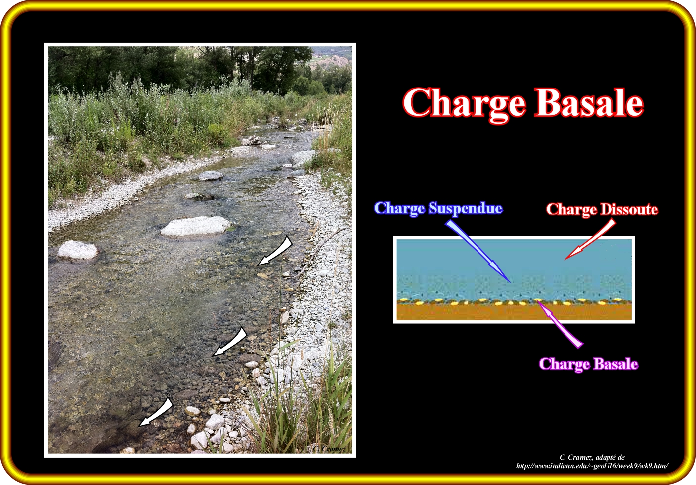 Comme l'illustré dans cette photo et schéma, une manière de saisir la charge basale d'un courant est de marquer une série de blocs de différente taille et de mesurer leur mouvement. Généralement, en aval, la charge basale d'un courant est plus faible et les cailloux sont plus arrondies qu'en amont. Cela est dû au frottement et abrasion qui causent les particules (blocs, cailloux, gravier, sable, etc.) quand elles entrent en collision les unes contre les autres et contre les parois et le lit du chenal (où le courant s'écoule), ce qui érode les textures rugueuses les rendant plus petites. Un transport sélectif contribue également à que les sédiments, en aval, soient plus fins qu'en amont. En fait, les particules plus grosses sont plus facilement emporté par le courant que les particules les plus petites. Les petites particules sont protégés par les plus grandes et nécessitent plus d'énergie pour être arrachées et les faire glisser vers l'aval. Les sédiments relativement plus grands sont transportés, soit par roulement, glissement ou saltation, à des vitesses inférieures à la vitesse d'écoulement, car ils sont trop grands pour rester en suspension dans le courant. Normalement, dans un courant, la charge basale représente environ 10% du montant total de sédiments transportés. Toutefois, des valeurs plus élevées ont été retrouvées dans les ruisseaux de montagne. L'érosion causée par un courant correspond à l'arrachement ou détachement du matériel rocheux à partir des flancs et du fond du canal où le courant il s'écoule. Environ 95% de l'énergie d'un courant est utilisée pour surmonter les effets de frottement imposés par le canal et par la friction moléculaire interne. Il ne reste que 5% de énergie du courant pour arracher les sédiments des parois et du lit du canal. N'oublions pas que l'action érosive d'un courant d'eau se fait de trois manières : (i) Dissolution ; (ii) Impact (action hydraulique) soit sur les marges soit sur la base du chenal, qui déloge les matériaux et les incorpore dans la charge basale et (iii) Abrasion, autrement dit, par le fait que les particules trop lourds pour être transportés par suspension roulent et rebondissent sur le lit du courant l'érodant progressivement.