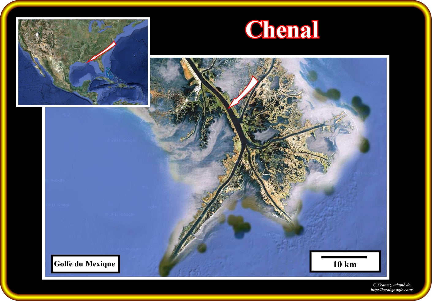 Sur cette photo, le principal chenal du delta digité du fleuve Mississippi, autrement dit, la dépression érosive, étroite et profonde qui met en communication le fleuve Mississippi avec une important masse d'eau (le golfe du Mexique) est clairement visible. Toutefois, en Géologie, et plus particulièrement dans l'interprétation géologique des lignes sismiques, ainsi que dans la stratigraphie séquentielle, le terme chenal est utilisé par de nombreux géoscientistes pour décrire les sédiments qui remplissent l'ancien lit d'un cours d'eau et non pas le lit lui-même, ce qui est très erroné. Dans les lignes sismiques, après la compaction, la morphologie des sédiments qui remplissent un chenal est fonction du faciès du remplissage. Si le remplissage est sableux, après compaction, la morphologie devient convexe, c'est-à-dire, le sommet et la base montrent une géométrie convexe. Inversement, si le remplissage du chenal est argileux, quand visible, c'est-à-dire quand il y a un contraste d'impédance acoustique entre les deux intervalles sédimentaires (remplissage et substratum), il moule, plus ou moins, le lit du cours d'eau soulignant, ainsi, la forme originelle du lit du courant. C'est-à-dire que la base a une géométrie concave lenticulaire et le sommet convexe. Théoriquement, comme indiqué plus haut (dépression érosive), un chenal est génétiquement associé à une érosion. Un chenal est toujours postérieur au substratum, qu'il érode et antérieur ou synchrone aux sédiments que le remplissent. Cependant, aussi sur ce point, il y a trop de confusion. Dans les cônes sous-marins de talus, par exemple, des nombreux géoscientistes appellent chenal turbiditique au remplissage de la dépression entre les digues naturelles marginales (levées) où les courants de turbidité (ou courants turbiditiques) s'écoulent. D'autre part, dans la plupart des cas, la dépression entre ces digues naturelles ne montre aucune d'érosion, mais, aussi, elle est contemporaine des digues marginales qui la forment. En d'autres termes, une fleuve nécessite de creuser un lit pour s'écouler, tandis qu'un courant de turbiditique, en général, non. Un courant turbiditique s'écoule sur une surface, plus ou moins, inclinée, respectant le principe du moindre effort. Par conséquent, les digues marginales naturelles d'un fleuve ou rivière sont toujours plus élevés que le remplissage du chenal fluvial, ce qui n'est pas toujours le cas dans les dépôts turbiditiques.