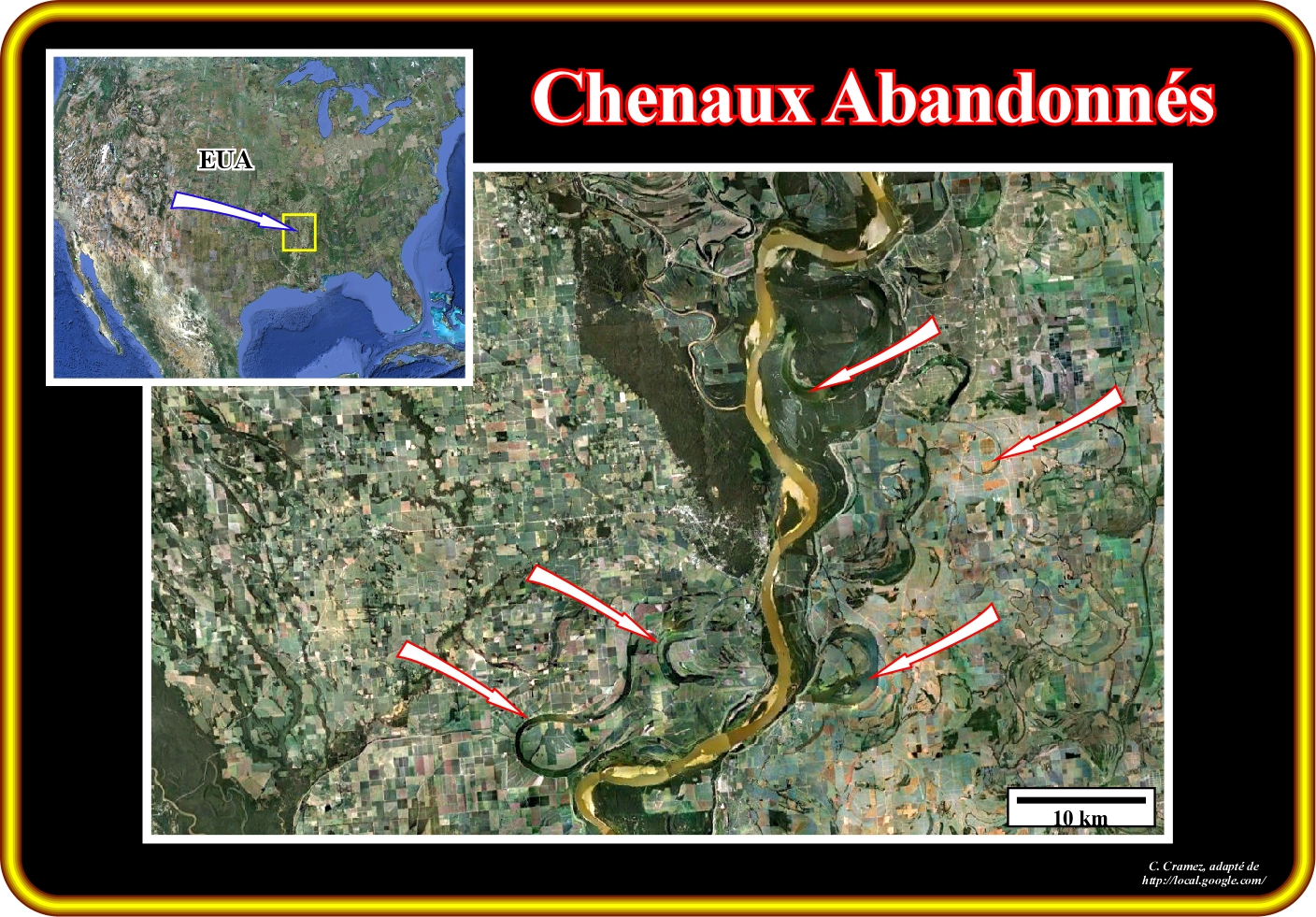 Sur cette photo, la genèse des chenaux ou méandres abandonnés est évidente. Dans un méandre, un fleuve s'écoule plus lentement dans la partie interne, ce qui permet le dépôt des sédiments plus fins qu'il transporte dans la marge convexe. Au contraire, dans la partie externe du méandre, le cours d'eau s'écoule avec une plus grande vitesse, ce qui cause l'érosion du banc extérieur. Ainsi, au fil du temps, l'arc du méandre (boucle) s’élargit, continuellement, jusqu'à que la gorge (ou nœud) du méandre disparaisse complètement. Éventuellement, l'arc du méandre s'isole du trajet du cours d'eau créant un chenal abandonné, qui, quand rempli d'eau, forme un lac très typique, c'est-à-dire, avec la forme d'un fer à cheval. En fait, une fois que l'eau cesse de s'écouler dans l'ancien lit du cours d'eau, il se forme un lac, où les sédiments fins et organiques se déposent sur place par décantation. Plus tard, tout cet ensemble peut se transformer en une zone marécageuse qui, très souvent, évolue en une prairie où les arbres s'enracinent facilement. Ce processus, par lequel ce qui était autrefois un cours d'eau devient, un jour, une forêt est parfois appelé succession. C'est cette succession d'événements géologiques (évident dans cette photo) qui a créée aux États-Unis d'Amérique du Nord, la plupart de l'onshore de la Louisiane et du Mississippi. L'abandon d'un bras de méandre est, rarement, brutal. En général, un cours d'eau retourne à son ancien lit, après un an ou deux, pour l'abandonner, à nouveau, après deux trois ans. Cette alternance de trajectoires des courants dans la plaine de méandres jusqu'à l'abandon définitif d'un bras de méandre (chenal abandonné) est corroborée sur les lignes sismiques (de préférence sur les lignes de haute résolution), quand elles recoupent une barre de méandre. En d'autres termes, les barres de méandre (intervalle sédimentaire, plus ou moins grossier, qui se dépose à l'intérieur des méandres avec une configuration interne progradante oblique) sont rarement fossilisés (latéralement) par un seul tampon argileux. La présence de cinq ou six tampons argileux n'est pas exceptionnelle. Chaque tampon argileux correspond au remplissage (argileux) pendant une période d'abandon du bras de méandre, c'est-à-dire, quand le courant avait une autre trajectoire.