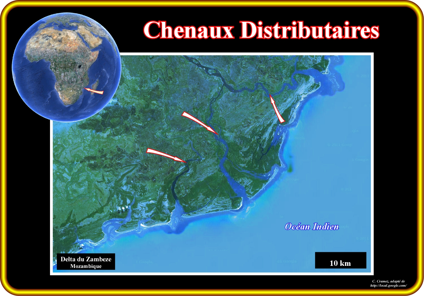 Cette photo illustre les chenaux distributaires du fleuve Zambeze (Mozambique). C'est le long des chenaux distributaires que l'apport sédimentaire est transporté vers la mer, afin de construire un édifice deltaïque, dont la géométrie progradante est déterminée par le dépôt des couches supérieures, frontales et inférieures (ou de base) qui forment les deltas. Il est important de ne pas oublier que la géométrie d'un édifice deltaïque (ne pas confondre avec la géométrie d'un delta, dont l'épaisseur varie entre 10 et 60 mètres) est, généralement, progradante complexe, une fois qu'à l'intérieur de l'édifice deltaïque, certains deltas ont des géométries progradantes obliques (sans les couches supérieures et, rarement, avec les couches inférieures) et d'autres ont une géométrie progradante sigmoïde (avec les trois couches). Par définition, un chenal distributaire (dépression où le courant s'écoule et non le remplissage de la dépression) est une structure sédimentaire érosive. Il est entaillé dans la barre d'embouchure déposée précédemment. Pour qu'un édifice deltaïque se déplace vers la mer (progradation), le courant doit ouvrir un chemin à travers les sédiments qu'il a déposé auparavant, afin d'acheminer les sédiments qu'il transporte vers l'aval, où il y a de l'espace disponible pour qu'ils se puissent déposer. L'érosion induite par les chenaux distributaires est clairement visible sur cette photographie. La continuité des barres d'embouchure est, brusquement, interrompue par les chenaux distributaires. Dans les édifices deltaïques fossiles, ou sur les lignes sismiques, le remplissage des chenaux distributaires souligne leur action érosive, puisque la configuration interne du substrat et du remplissage sont très différents et non concordantes. Dans la stratigraphie séquentielle, lorsque l'incision des chenaux distributaires est important, elle est utilisée pour déterminer les limites des cycles stratigraphiques, une fois que l'incision (quand significative) se forme lors d'une baisse relative du niveau de la mer, qui est la cause principale de la surface d'érosion qui crée la discordance (quelle soit ou non, plus tard, renforcée par la tectonique) entre deux cycles stratigraphique consécutifs (cycle-séquence, sous-cycle d'empiétement continental, etc.).
