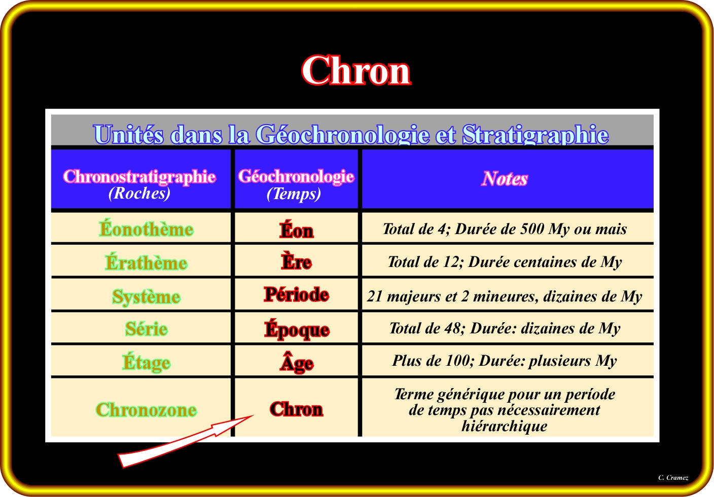 L'unité géochronologique correspondant à une chronozone, c'est-à-dire, un ensemble de roches formées n'importe où pendant un certain intervalle de temps de n'importe quelle unité stratigraphique ou événement géologique. Les roches formées pendant les intervalles de polarité (magnétique) normale ou inverse qui durent, habituellement, entre 10 k et 10 M ans, se définissent par chrons. Ex: intervalle stratigraphique entre chron C_33n et C_29r (Campanien tardif à Maestrichien). Notons que, r signifie polarité inverse et n polarité normale.