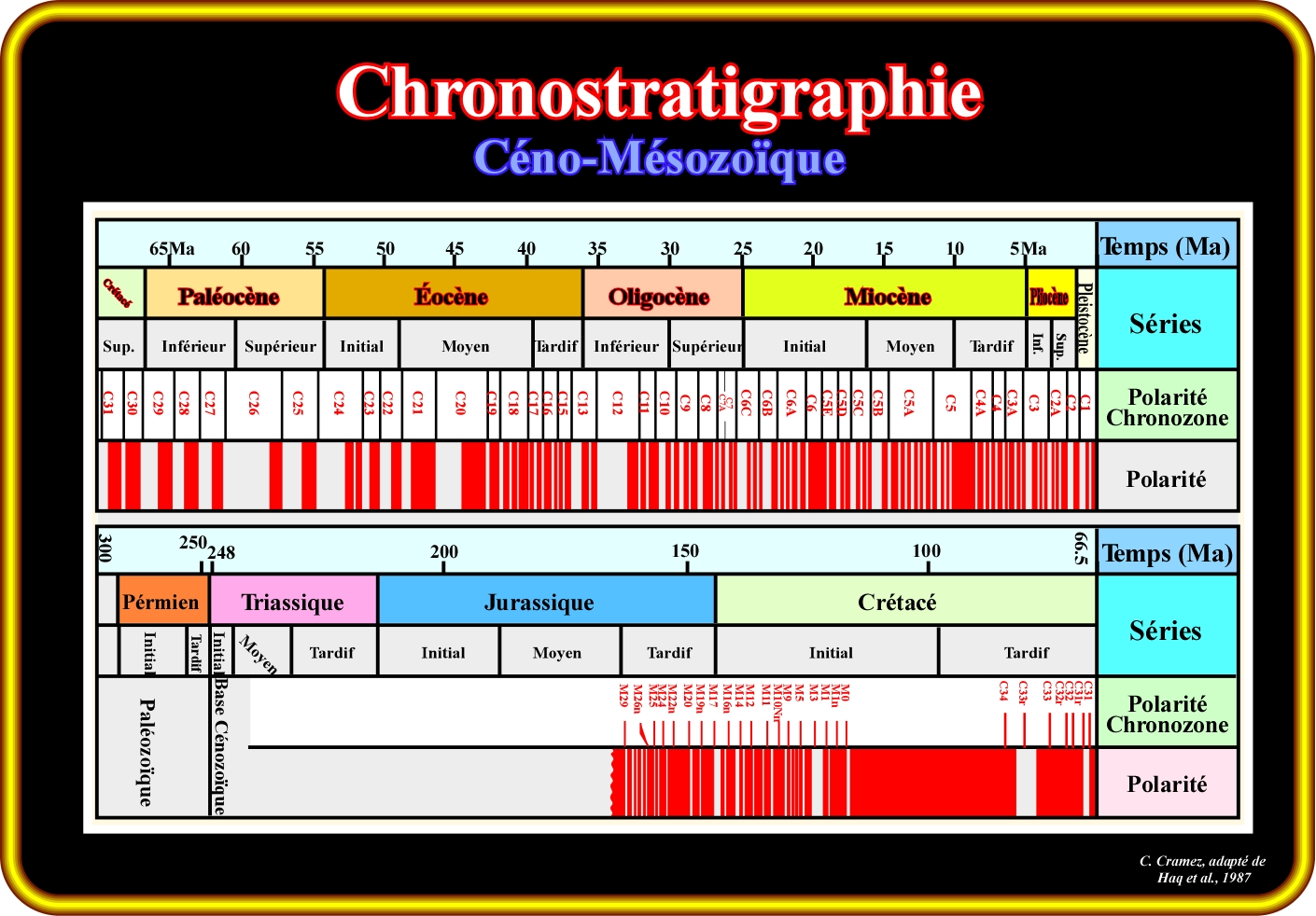 Dans cette chronostratigraphie du Méso-Cénozoïque qui a été proposé par Haq et al (1987), les séries du Pliocène au Trias sont corrélés en temps absolu (Ma), chronozones et polarité. Le chronostratigraphie est basée, principalement, en intervalles de temps paléontologiques définis par un ensemble de fossiles et sur la loi de la superposition. Les principales unités chronostratigraphiques sont les suivantes : (i) Éonothème (par exemple, Phanérozoïque) ; (ii) Érathème (par exemple, Mésozoïque) ; (iii) Système (par exemple, Crétacé) ; (iv) Série (par exemple, Crétacé Supérieur) ; (v) Étage (par exemple Maestrichien). Il est important de ne pas confondre les unités chronostratigraphiques avec les unités géochronologiques. Les premières sont un matériel géologique et les secondes, c'est-à-dire, les unités géochronologiques sont des unités de temps. Ainsi, ont doit dire que un certain fossile est caractéristique du système crétacé (unité chronostratigraphique) ou que ce fossile a vécu durant la période Crétacé (unité géochronologique) et non que ce fossile est caractéristique de la période Crétacé ou que ce fossile a vécu dans le système Crétacé. La chronostratigraphie est une branche très importante de la stratigraphie, une fois qu'une bonne corrélation entre l'âge des différentes roches est une condition sine qua non pour proposer des coupes géologiques et des reconstitutions paléogéographiques cohérents, c'est-à-dire, difficiles à réfuter et non nécessairement vraies, puisque que dans la Science la vérité n'existe pas. Cela signifie qu'en Géologie une hypothèse peut être réfutée ou corroborée, mais jamais vérifiée. Actuellement, la chronostratigraphie est, beaucoup, basée sur la géologie isotopique et géochronologie pour dater les unités rocheuses qui sont caractérisées par un ensemble de fossiles index (caractéristiques).