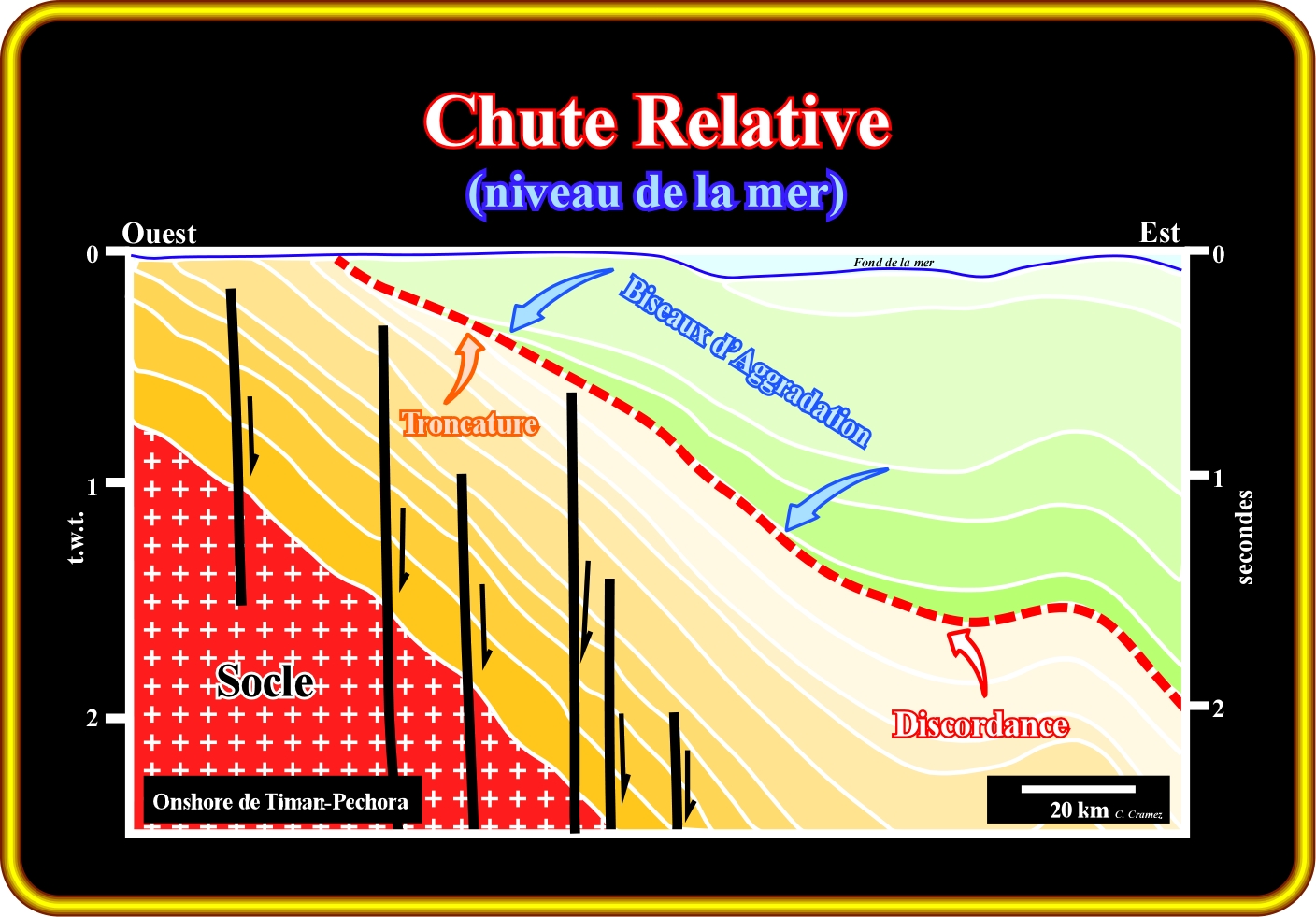 Dans cette tentative d'interprétation géologique d'une ligne sismique de l'onshore Timan-Petchora (Russie), la discordance majeure (en pointillé) est une surface d’érosion, qui a été causée par une chute relative du niveau de la mer significative. Elle limite les sédiments tronquées (sédiments sous-jacents) et les sédiments, qui reposent contre elle (sédiments sus-jacents) par des biseaux d'aggradation. Les sédiments sous-jacents à la discordance ont été, partiellement, érodés comme le suggèrent les biseaux sommitaux ou supérieurs (troncature) et, aussi, la variation de l'épaisseur de l'intervalle sédimentaire immédiatement au-dessus de la discordance. Les sédiments sus-jacents fossilisent la discordance par des biseaux d'aggradation (biseaux d'aggradation côtiers) qui sont, particulièrement, bien marqués. Tous les discordances, même celles, qui, localement, ont été renforcées par la tectonique, sont des surfaces d'érosion, plus ou moins, bien visibles, induites par des chutes relatives du niveau de la mer, qui placent le niveau de la mer plus bas que le rebord du bassin ou de la plaine côtière, quand le bassin n'a pas de plate-forme continentale. Quand un bassin sédimentaire n'a pas de plate-forme, pratiquement, le rebord du bassin coïncide avec la limite externe de la plaine côtière ou, en d'autres termes, avec la ligne de côte. Même lorsque la subsidence est important, c'est l'eustasie que détermine les descentes relatives du niveau de la mer, ainsi que la cyclicité les variations eustatiques sont beaucoup plus rapides et fréquentes, que les changements tectoniques (probablement pas, dans les bassins d'avant-pays). L'âge d'une discordance est donné par l'âge de la chute relative du niveau de la mer, autrement dit par l'âge des cônes sous-marin cônes de bassin associés (l'âge du plus petit hiatus de non-dépôt).