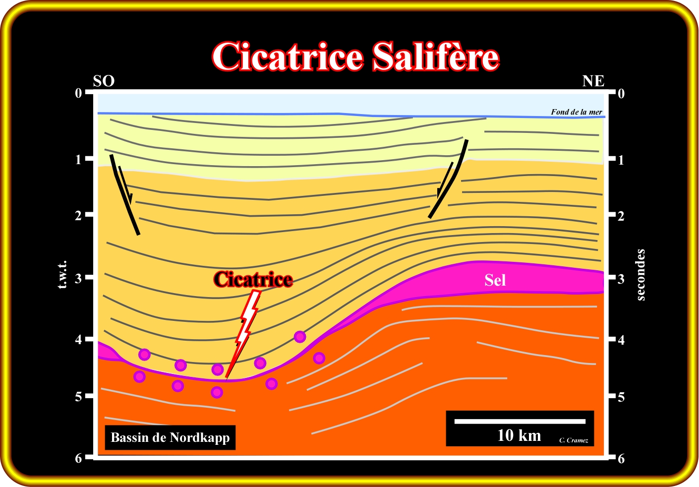 Ce détail d'une ligne sismique de l'offshore profond ( > 200 mètres de tranche d'eau) du Golfe du Mexique, illustre, parfaitement, les équivoques associes à une mauvaise terminologie. La majorité des géoscientistes, avec expérience dans l'interprétation géologique des lignes sismiques, en regardant ce détail, dira que les flèches indiquent des chenaux turbiditiques, ce qui est basiquement faux. Mise à part une petite érosion (probablement provoquée par le courant turbiditiques initial) du substratum, sous les digues marginales naturelles, visibles dans le coin inférieur droit, on peut dire qu'il n'y a jamais eu d'érosion. Ce que certains géoscientistes interprètent comme un chenal, par où ont passé les courants turbiditiques, est, très souvent, simplement la dépressions entre les digues marginales naturelles turbiditiques (dépôt de débordement), qui s'est formée, peu à peu, au fur et à mesure, que les digues se sont déposées. Notons que avec le temps, la position de la dépression entre les digues migre vertical et latéralement. Évidement, que plus de digues marginales naturelles se déposent, plus la dépression est marquée, ce qui force les courants turbiditiques à l'emprunter (chenalisation) pour amener les sédiments vers les parties les plus profondes du talus continental et plaine abyssal. Quand les courants turbiditiques perdent vitesse, compétence et capacité, le système de déposition est dévié ou abandonné et la dépression entre les digues naturelles est remplie (en rétrogradation) par des sédiments plus récents (bien que appartenant au même cycle-séquence) que les sédiments qui forment les digues naturelles. Ce mécanisme géologique n'a rien à voir avec la formation des digues naturelles naturelles fluviales et des remplissage des chenaux fluviaux. D'autre part, dans cette ligne sismique, il est facile de constater que les remplissages des dépressions et digues naturelles sont, pratiquement, au même niveau, ce qui n'est pas le cas des rempliasses des chenaux fluviaux.