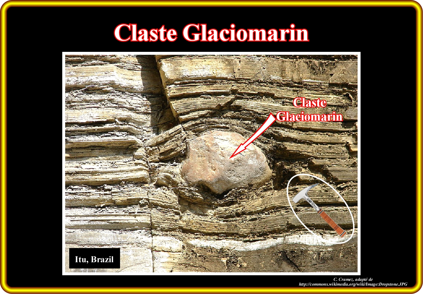 Cette photographie montre un claste glaciomarin de quartzite au milieu de dépôts fluvio-glaciaires. Sur la surface du claste, on remarque l'effet de l'abrasion induite par le mouvement du glacier (érosion que les fragments transportés par un glacier souffrent et produisent quand ils grattent les roches du substratum). De même, il est intéressant de noter les effets de la compaction différentielle entre le claste et les sédiments fluvio-glaciaires au milieu desquels il se trouve (les sédiments sont beaucoup plus compactés au-dessus et en-dessous du claste). En fait, le taux de compaction des sédiments est facile à calculer, car le claste n'étant pas, pratiquement compactable, donne, approximativement, l'épaisseur original des sédiments (avant compaction). Les clastes glaciomarins font partie d'une grande famille de blocs de roche que les géoscientistes appellent blocs erratiques, une fois qu'ils sont déposés dans des environnements sédimentaires où, normalement, ils ne devraient pas se trouver. En général, les blocs erratiques ou "blocs tombés" peuvent être transportés par quatre moyens de transport différents : (i) Glaciers, quand ceux-ci fusionnent, ils déposent les fragments qu'ils transportent ; la même chose arrive avec les icebergs : un fois qu'ils entrent dans la mer, ils commencent, peu à peu, à fondre laissant tomber au fond de la mer tous les fragments rocheux qu'ils transportent ; (ii) Volcans, lors des explosions, non seulement les bombes volcaniques, mais aussi d'autres roches peuvent voler des kilomètres et donc intégrer dans des milieux sédimentaires complètement différents ; (iii) Courants turbiditiques, qui peuvent, également, transporter pour les parties les plus profondes des bassin sédimentaires, d'énormes blocs arrachés soit au rebord du bassin soit aux parois des canyons ou des dépressions par où, souvent, ils passant ; (iv) Radeaux biologiques, comme, par exemple, ceux constitués de restes de plantes que, en général, sont formés pendant les périodes d'inondation, en particulier des forêts et qui peuvent transporter des fragments de roche, avec des dimensions importantes, pendant des centaines, voire même des milliers de kilomètres, pour ensuite les laisser tomber au fond de la mer.