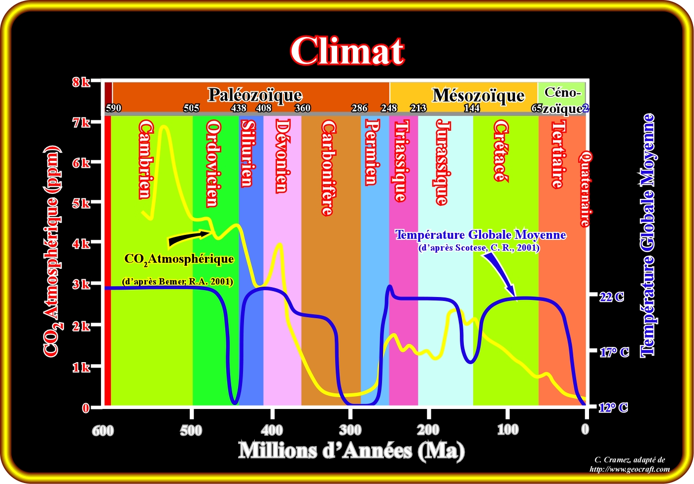 Au début du Carbonifère, la température moyenne globale était de 20° C, bien que dans le Carbonifère Tardif, elle n'était que de 12° C, soit une température comparable à la moyenne de la température mondiale d'aujourd'hui. D'autre part, au début du Carbonifère, la concentration de CO_2 dans l'atmosphère était, plus ou moins, de 1500 ppm, mais, dans le Carbonifère Moyen, elle est tombée à 320 ppm, ce qui est à peu près la concentration actuelle. En fait, à l'heure actuelle, l'atmosphère contient environ 380 ppm de CO_2 (0,038%). Cependant, dans le derniers 600 Ma (millions d'années) uniquement dans le Carbonifère et Quaternaire la concentration de CO_2 dans l'atmosphère a été était inférieure à 400 ppm. Géologiquement, il y a eu toujours une forte concentration de CO_2 dans l'atmosphère qu'à l'heure actuelle. Au cours du Jurassique, la concentration était de 1800 ppm, soit quatre fois plus élevé qu'aujourd'hui. Les plus fortes concentrations ont été au Cambrien (7000 ppm). Probablement, tout cela signifie que la concentration de CO_2 dans l'atmosphère a peu d'influence sur la température et climat, ce qui est soutenu par le fait que dans l'Ordovicien Supérieur, au cours du quel les glaciations ont été très abondantes, la concentration de CO_2 dans l'atmosphère était 12 fois la concentration actuelle. D'autres facteurs semblent avoir une influence plus grande sur la température et climat, comme les cycles solaires. Les glaciations surviennent, périodiquement, dans la surface de la Terre et semblent avoir une double périodicité. La première est associée à la cyclicité des périodes géologiques. En effet, lorsque les régimes tectoniques en compression sont prépondérants, ils plissent et soulèvent les sédiments formant des montagnes, où les températures sont plus basses. La seconde est associée aux variations cycliques de la température, pour lesquelles plusieurs hypothèses ont été avancées tenant compte du fait qu'à la surface de la Terre, le bilan thermique est contrôlé par la quantité de rayonnement reçue du soleil.