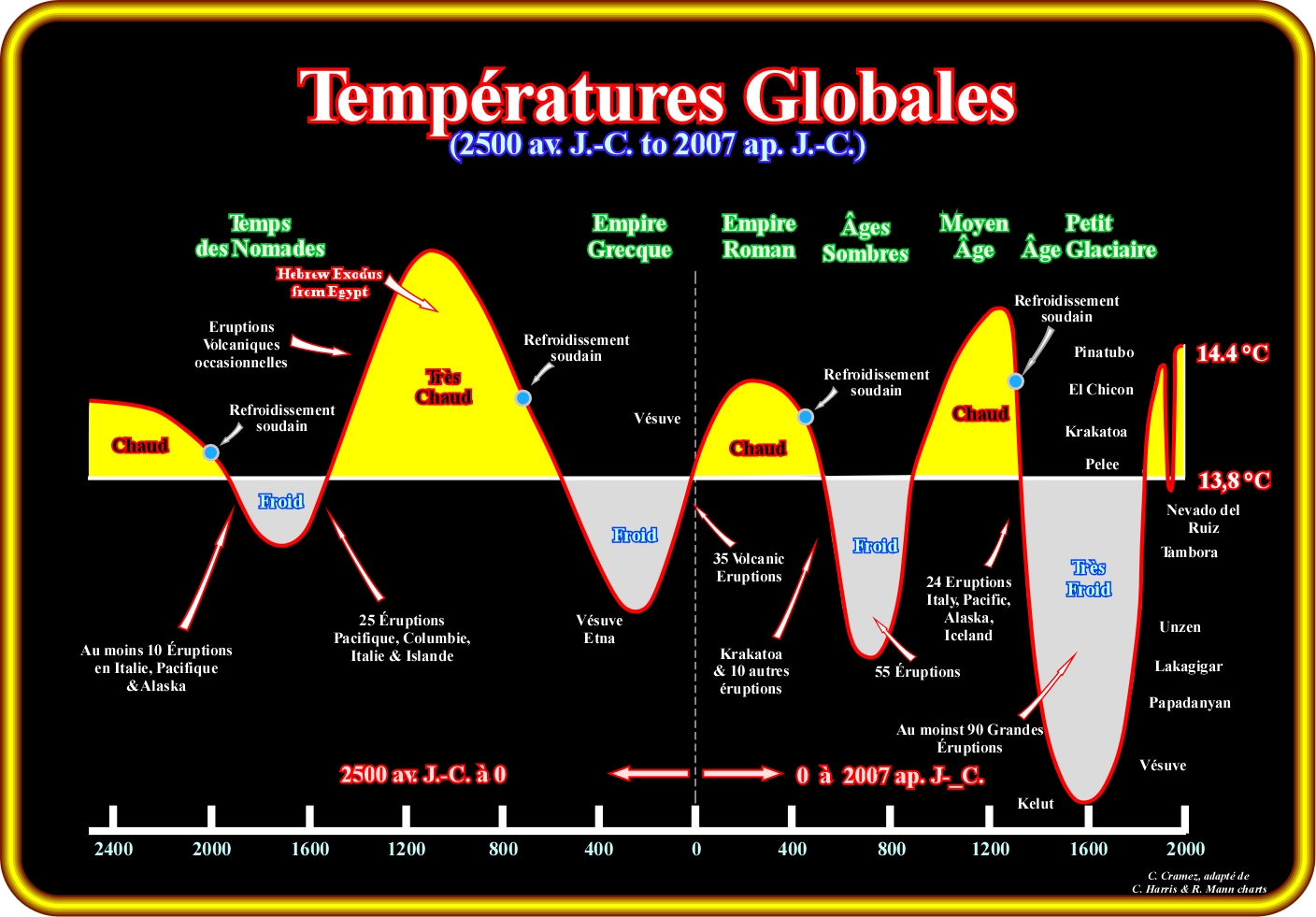 Depuis la formation de la Terre (4.5 Ga), les changements climatiques sont une réalité. Historiquement, les périodes chaudes et froides sont bien connues. Depuis 2500 ans avant Jésus-Christ jusqu'à présent, il y a eu six périodes chaudes qui correspondent, grosso modo, aux périodes suivantes : (i) Pré-dynastie de l'Égypte ancienne ; (ii) Périodes intermédiaires de l'Égypte ancienne ; (iii) Empire Romain ; (iv) Âge Moyenne ; (v) XIXème et XXème siècles ; (vi) XXIème siècle. Les périodes froides correspondent, plus ou moins, aux moments suivants : (a) Temps des Nomades ; (b) Empire Grec ; (c) Âge des Ténèbres du Moyen Age ; (d) Petit Âge Glaciaire ; (e) Fin du XXème siècle (cette courte période de temps froid, pendant laquelle la température moyenne a diminué d'environ 1° C, a été induite par l'éruption volcanique du Pinatubo). Ces changements climatiques historiques réfutent, complètement, la conjecture admise à priori par les "alarmistes" sur le réchauffement climatique. En fait, quand ils affirment que la stabilité du climat avant la révolution industrielle, a été brisée par l'influence humaine, ils savent parfaitement bien qu'ils mentent. Comme l'histoire du climat falsifie le dogme des «alarmistes», ils ne le prennent pas en compte. Comme indiqué par R. Giegengack (géologue à l'Université de Pennsylvanie) : «Les gens viennent me dire: Arrêtez de parler comme cela, vous faite mal à la cause» (cité par C. Horner, 2007). Notons que les périodes froides correspondent à des périodes de forte activité volcanique, famine et maladie, et que les périodes chaudes à des temps florissantes avec une activité volcanique faible. Malgré le fait qu'une corrélation ne signifie pas nécessairement causalité, tels concordances ne cadrent pas avec les catastrophes et famines annoncées par les "alarmistes".