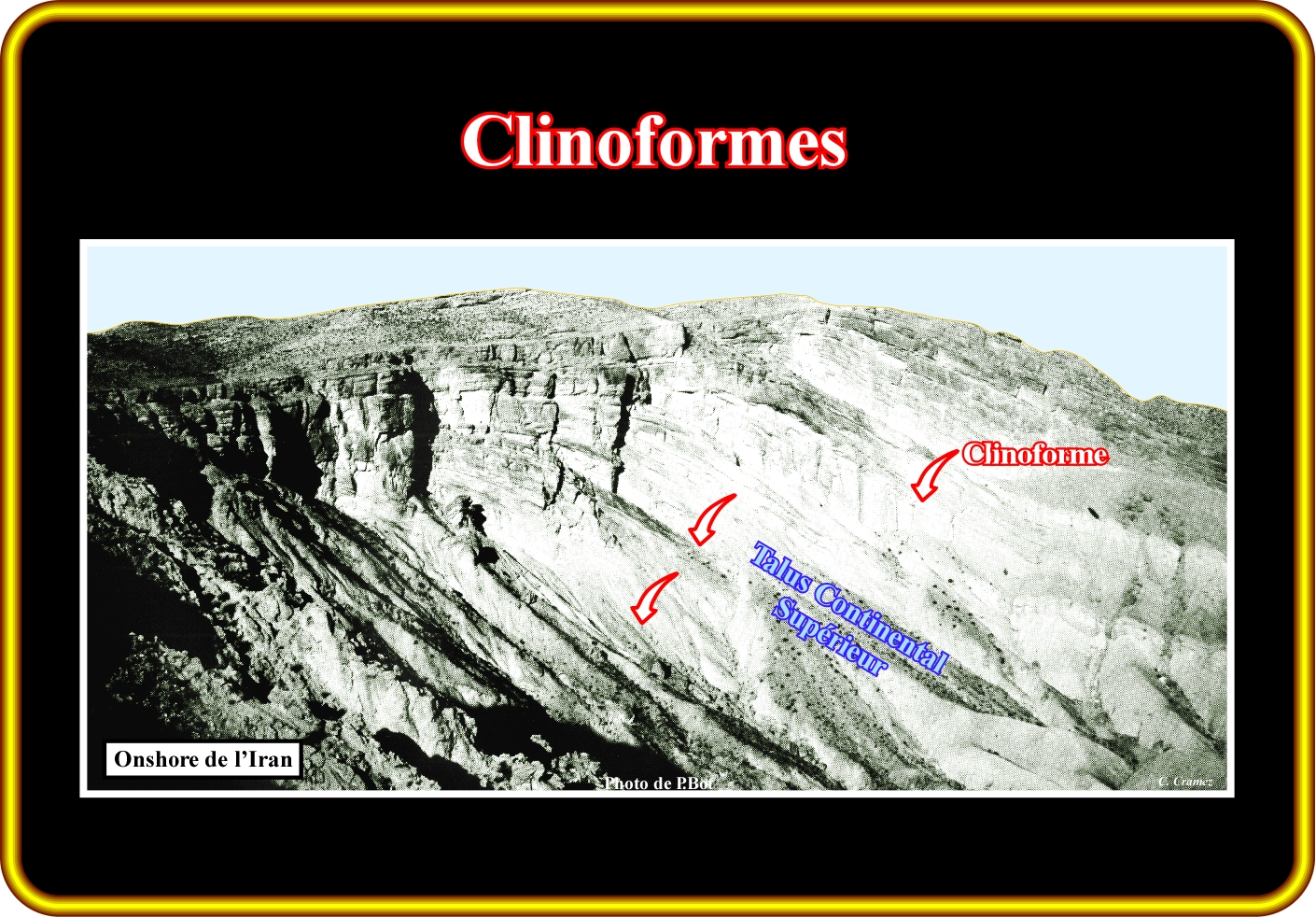 Dans cette photo (P. Bot, 1990), dont les dimensions sont, plus ou moins, 400 par 150 mètres, les clinoformes (ou surfaces clinoformes, comme disent certains géoscientistes) sont, facilement, reconnaissables. De même, il est facile de voir que ces surfaces relient les environnements sédimentaires des eaux peu profonde avec des environnements d'eau profonde, c'est-à-dire, qu'elles soulignent un talus continental et non un talus deltaïque. Le talus d'un delta (ne pas confondre un delta avec un édifice deltaïque) est relativement petit, puisque l'épaisseur d'un delta varie, plus ou moins, entre 10-50 mètres. Certains géoscientistes utilisent le terme clinoforme pour désigner, aussi, les surfaces de déposition inclinées vers la mer (progradations) associées aux sédiments transgressifs, une fois qu'une transgression est, tout simplement, une superposition de régressions chaque fois plus petites. En fait, nous ne devons pas oublier que les sédiments clastiques viennent toujours du continent et que pour avoir dépôt, en amont du rebord du bassin, il est nécessaire créer de l'espace pour les sédiments, soit pendant une transgression ou soit pendant une régression. Cela signifie qu'il faut avoir toujours une montée relative du niveau de la mer. En d'autres termes, sur le terrain ou sur les lignes sismiques (de bonne résolution), à l'intérieur d'un cortège transgressif d'un cycle-séquence, il y a toujours des progradations. Toutefois, ces progradations ne soulignent pas un talus continental mais un talus, en général, deltaïque, en amont du rebord continental. Une interprétation géologique dépend toujours de l'échelle. Cependant, pour des raisons absurdes de confidentialité, les géoscientistes d'Exxon ont été obligés à supprimer les échelles des figures dans les premières publications sur la stratigraphie séquentielle (1977). Fonction de l'échelle, une progradation peut être interprétée comme : (i) Une simple lamination ; (ii) Un plan de stratification ; (ii) Un dépôt de débordement ; (iv) Un talus deltaïque ; (v) Une pente continentale, etc..