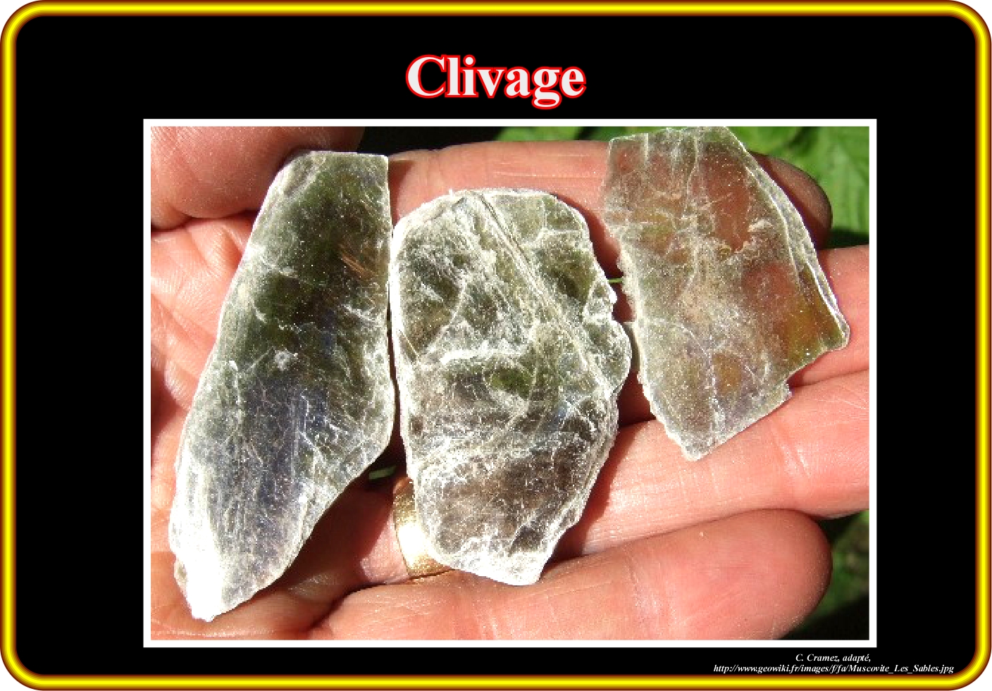 Propriété d'un minéral de se partir le long d'un plan appelé plan de clivage qui marque la direction des liaisons les faibles entre les atomes.
