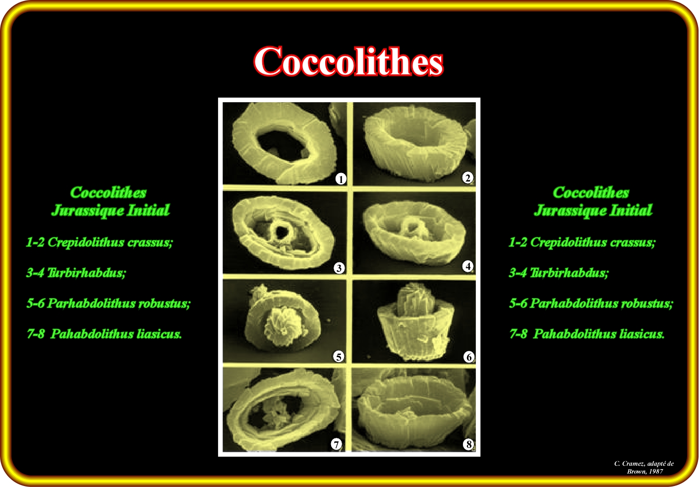 Plaques de carbonate de calcium formées par des algues simples comme "l'Emiliana huxlei" (coccolithophores) qui se disposent autour d'elles en coccosphères. Les coccolithes sont formées à l'intérieur des cellules en vésicules provenant du corps ou appareil de Golgi (organite qui se trouve dans la plupart des cellules eucaryotes). Lorsque un coccolithe est complet, les vésicules fusionnent avec la paroi cellulaire et le coccolithe est intégré dans la coccosphère.