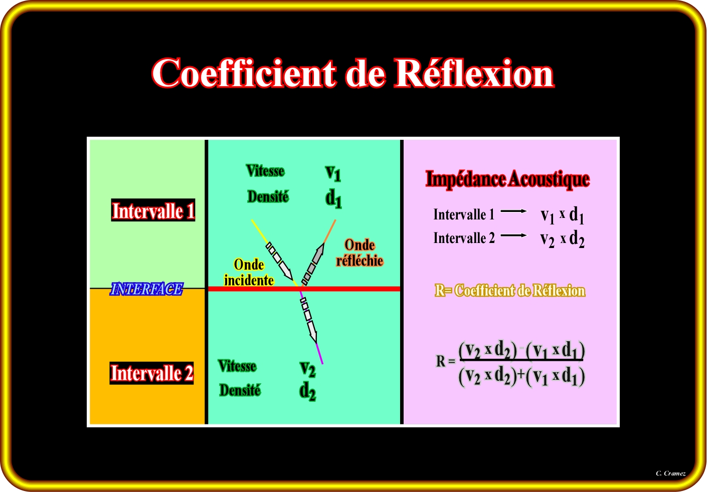 Toutes les ondes sismiques incidentes obliques sont brisées en ondes réfléchies et réfractées. En supposant que deux intervalles sédimentaires avec des vitesses (v_1 et v_2) et densités différentes (d_1 et d_2), c'est-à-dire avec des impédances acoustiques différentes (v_i x d_i), le coefficient de réflexion est donné par le rapport entre la différence et la somme des impédances. Sur les lignes sismiques, un réflecteur souligne le coefficient de réflexion des interfaces sédimentaires. Plus le contraste entre les impédances des deux intervalles, qui définissent l'interface, est grand, plus grand sera l'amplitude de la réflexion. Si l'intervalle supérieure a une impédance plus petite que celle de l'intervalle inférieur, l'amplitude de la réflexion sera positive, sinon, elle sera négative. Il est rare que le coefficient de réflexion reste, plus ou moins, constante sur de longues distances. Les impédances changent latéralement. Un changement latéral de faciès (lithologie), dans un intervalle sédimentaire, implique forcément un changement latéral de l'impédance acoustique. L'amplitude du réflecteur associé à une discordance et en particulier, à une discordance angulaire (discordance eustatique renforcée par la tectonique), varie latéralement et peut, même, changer de signe, c'est-à-dire, qu'elle peut être, dans un certain endroit, positive et, dans un autre, négative. En fait, le profil de l'impédance acoustique change, latéralement, en fonction des interfaces sédimentaires définies par les biseaux sommitaux (ou supérieurs) et les biseaux d'aggradation qui caractérisent la discordance (surface d'érosion induite par une chute relatif du niveau de la mer). Le coefficient de réflexion d'une interface sédimentaire peut, aussi, changer, latéralement, en fonction du saturant (huile, gaz ou eau) qui remplit total ou partiellement la porosité des roches, qui définissent l'interface. Un exemple très intéressant se produit dans les intervalles sédimentaires plissés qui forment un piège pour les hydrocarbures. Si dans un piège anticlinal, la roche-réservoir est saturée de gaz, l'impédance acoustique est, localement (là où il y a du gaz), plus petite, ce qui peut changer le signal de l'amplitude de l'interface (roche-réservoir, roche de couverture) et créer une anomalie d'amplitude.