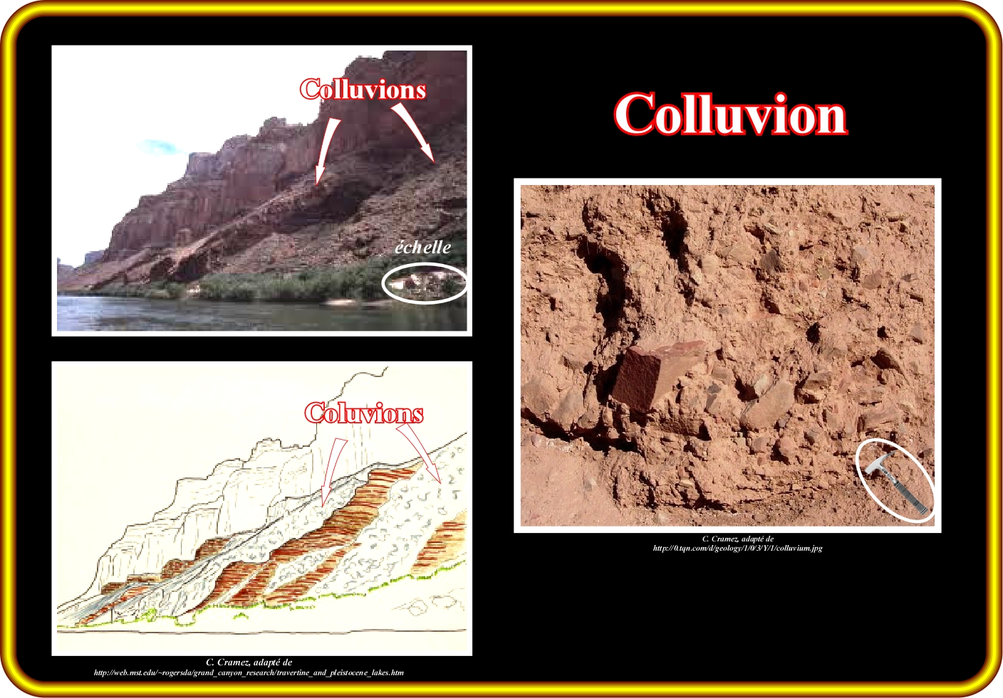Dépôt meuble sur un versant. Corps sédimentaire inconsistant déposé ou accumulé à la base d'une pente légèrement inclinée ou contre une barrière dans la pente, dont les sédiments ont été transportés par la force de gravité. Souvent, les colluvions sont interdigitées avec des alluvions (dépôts transportés par l'eau qui s'écoule le long de la pente).