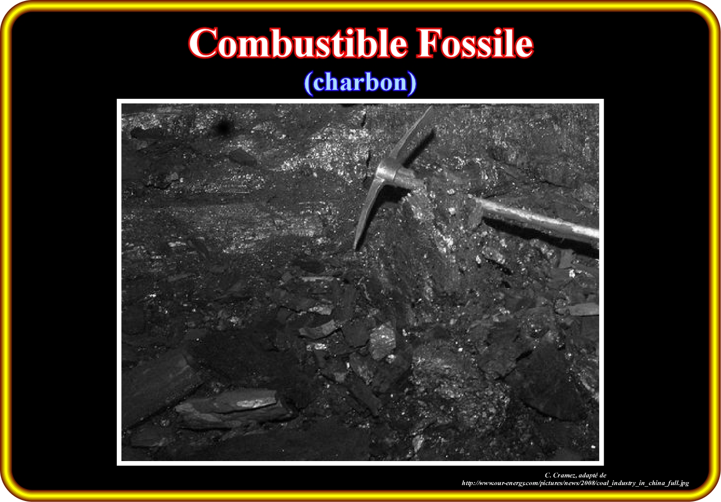 Combustible géologique (hydrocarbures) d'origine biologique tels que le charbon, huile, gaz naturel, argiles bitumineux, sables asphaltiques, etc.