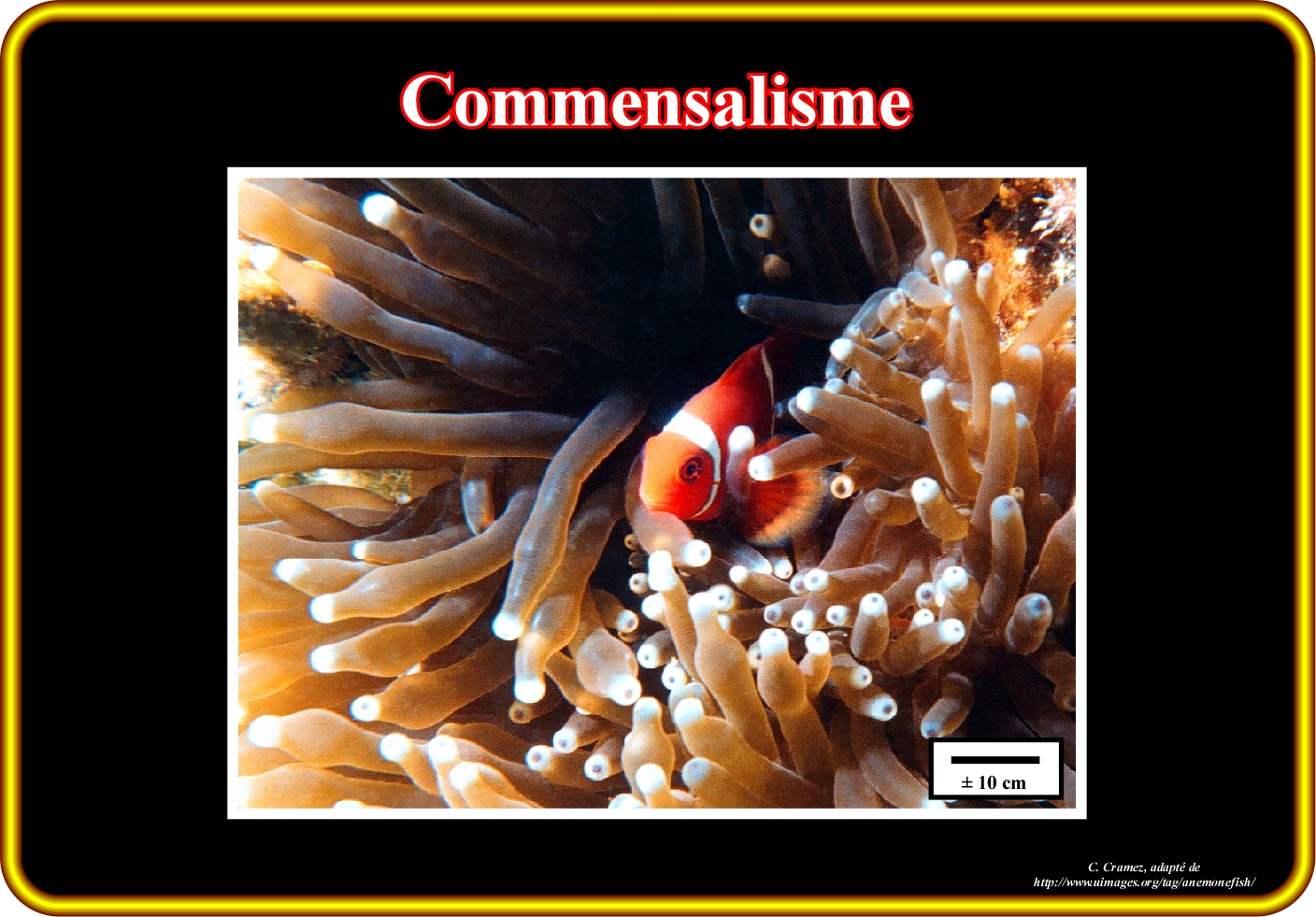 Le commensalisme, autrement dit, toute relation alimentaire ou non, entre deux espèces qui vivent ensemble et dans laquelle une espèces profite sans nuire à l'autre, est beaucoup plus difficile de démontrer que le mutualisme. Dans le commensalisme, une des espèce ne doit pas être affectée par la présence de l'autre. Cependant, des études détaillées, suggèrent que la première espèce a toujours un petit effet sur la seconde. Dans le cas du commensalisme entre les bernacles (crustacés qui s'accrochent aux pétoncles, rochers et coques des navires) et les pétoncles (mollusque bivalves de la famille des Pectinidés: Pectem maximus Lin.), les pétoncles peuvent être affectées par la présence de bernacles. En effet, les pétoncles se nourrissent, essentiellement, des mêmes plantes et animaux planctoniques que les bernacles. Par conséquent, il peut y avoir concurrence pour la nourriture entre eux. Par ailleurs, il est difficile de prouver que le poids de bernacles sur les coquilles des pétoncles ne perturbe pas les mouvements des coquilles. D'autre part, la présence de bernacles sur les coquilles des pétoncles peut réduire la prédation sur les pétoncles des gastéropodes marins qui percent les coquilles pour atteindre leur intérieur. Comme l'illustré, les poissons-clowns (Amphiprion ocellaris) vivent parmi les tentacules des anémones et sont protégés contre les éventuels prédateurs qui ne sont pas immunisés à la piqûre des anémones. Ces poissons sont protégés contre la piqûre des tentacules d'anémones par une substance dans la doublure de leur peau. La nature exacte de la substance protectrice n'est pas connue mais est, probablement, une combinaison d'une sécrétion naturelle des poissons et des produits chimiques acquis par le frottement contre les tentacules des anémones. Les anémones traitent les poissons clowns comme une partie d'elles même et ne les mordent pas. Cette relation est un cas typique de mutualisme, car les poissons clowns, à son tour, chassent les autres poissons qui peuvent attaquer les anémones.