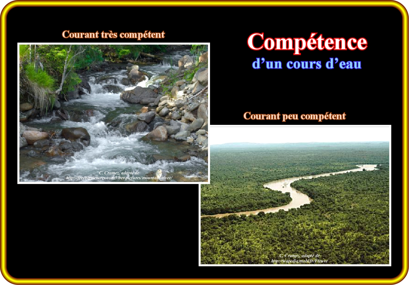 Comme l'illustré dans cette figure, le diamètre des particules transportées au cours des périodes de crues, suggère fortement que ces deux courants ont des compétences différentes. Tous les courants s'écoulent vers l'aval en raison de la gravité. La compétence d'un courant reflète la possibilité qu'elle a de transporter une taille particulière de particules sédimentaires. En ce qui concerne le calcul de la capacité et compétence d'un courant, tous les mouvements d'eau doivent être pris en compte. Dans des conditions normales, le principal facteur qui contrôle la compétence et capacité d'un courant est l'inclinaison du canal (appelé aussi, par certains géoscientistes, gradient du courant), qui est la différence d'altitude du courant entre deux points divisée par la distance entre deux points de mesure. La vitesse d'écoulement de l'eau est, directement, contrôlée par l'inclinaison du chenal (correspond à l'inclinaison du thalweg). Plus l'inclinaison est grande, plus grande sera la vitesse de l'écoulement. Une augmentation de la vitesse d'écoulement de l'eau augmente la compétence de courant. Ainsi, dans le delta du Mississippi, près de l'embouchure du fleuve, la compétence et capacité du fleuve sont minimes. Au contraire, le fleuve Colorado, dont le lit descend à travers le Grand Canyon (le thalweg incline environ 20 mètres par kilomètre), a une vitesse d'écoulement qui donne une grande capacité et compétence au Colorado. La canalisation (terme plutôt utilisé pour les pipelines) de l'eau d'un courant est, également, un paramètre critique qui affecte beaucoup sa capacité et compétence. Cela signifie que lorsque le canal du courant (où l'eau s'écoule) est très étroit la la vitesse augmente et quand il est trop large, la capacité et compétence diminuent. La quantité de matériel transportée par un courant est proportionnelle à la vitesse et au gradient du courant, lequel correspond à la quantité de matière transportée à travers un point durant une certaine période de temps. En d'autres termes, plus la vitesse d'un courant est grande, plus grande est la quantité de matière transportée.