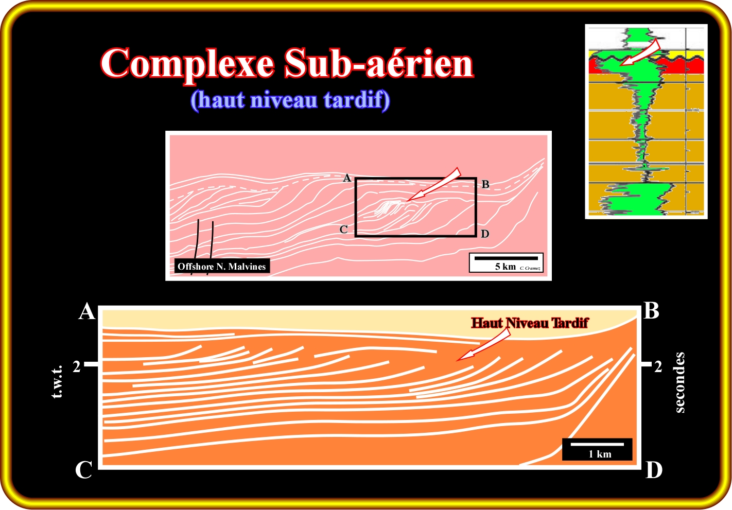 Dans cette tentative d'interprétation géologique d'une ligne sismique de l'offshore des Malouines (Argentine), un intervalle progradant est, facilement, reconnaissable, même si la partie supérieure des clinoformes n'est pas visible dû à un manque de contraste de l'impédance acoustique. Bien que l'amplitude de ces clinoformes diminue vers le nord (gauche de la ligne sismique), ils soulignent, très probablement, les talus continentaux successifs de la marge divergente. En fait, l'amplitude des clinoformes associés aux prodeltas dépasse rarement 30 à 60 mètres, ce qui signifie qu'elle est inférieure à la résolution sismique des lignes sismiques et que ces clinoformes deltaïques ne seraient pas visibles. De toute façon, la géométrie des réflecteurs suggère une diminution de la profondeur d'eau de déposition, au fur et à mesure, du dépôt des clinoformes, ainsi qu'un environnement sub-aérien et une lithologie sableuse, en association avec des biseau sommitaux (clairement visibles dans le centre et nord, c'est-à-dire, à la gauche du complexe progradant dans le rectangle ABCD). En fait, cette conjecture ne sera pas réfutée si les diagraphies d'un puits d'exploration sont similaires à celles illustrées dans la partie supérieure droite de cette figure. Dans la réalité, ces diagraphies (gamma ray à gauche et résistivité à droite), permettent de reconnaître de bas vers le haut : (i) Cônes sous-marins de bassin et, probablement, aussi, de talus, caractérisés par une morphologie du gamma ray, plus ou moins, cylindrique ; (ii) Une prisme de bas niveau, caractérisé par une morphologie grano et stratocroissante du gamma ray, ce qui suggère que la profondeur d'eau de dépôt devient plus faible et le faciès (lithologie) plus sableux ; (iii ) Un petit cortège transgressif au-dessus du prisme de bas niveau ; (iv) Une discordance (ligne ondulée), autrement dit, une surface d'érosion entre les dépôts sub-aériens du prisme de haut niveau (soulignés par la flèche) et les sédiments qui remplissent une vallée incisée, qui s'est formée au cours de la descente relative du niveau de la mer, qui a créée la discordance, une fois que les profiles provisoires des cours d'eau ont été rompus.