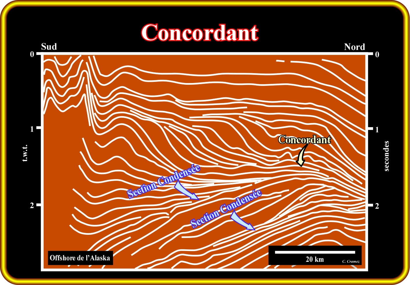 Lorsque les couches ou les réflecteurs sismiques sont parallèles à une limite d'un cycle stratigraphique, ou quand il n'y a pas d'évidence d'une terminaison des strates ou réflecteurs contre une limite de cycle stratigraphique. Une concordance n'implique pas, nécessairement, une absence d'érosion. En fait, une certaine quantité de l'érosion se produit dans toutes les limites des cycles stratigraphiques. Les intervalles de temps associés à une discordance ou une discontinuité peuvent représenter des périodes, plus ou moins, prolongées d'exposition sub-aérienne avec un minimum d'érosion, comme dans des vallées ou canaux incisés, qui ont, souvent, des dimensions inférieures à la résolution sismique.