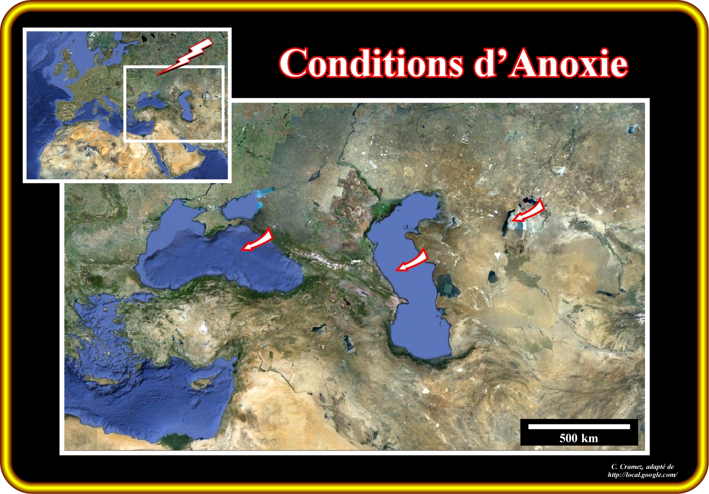 Des conditions d'anoxie existent : (i) Dans la Mer Noire, en dessous de 50 m de profondeur ; (ii) Dans la Mer Caspienne, en dessous de 100 m de profondeur ; (iii) Dans l'Est de la Méditerranée (bassin de Bannock ) et (iv) Dans de nombreuses autres mers, plus ou moins, fermées. Actuellement, il y a des indications que l'eutrophisation (augmentation de nutriments, c'est-à-dire, d'aliments qu'un organisme a besoin pour vivre et grandir, qui sont retirés de l'environnement) a été responsable par l'augmentation de l'extension de conditions anoxiques, comme dans le Golfe de Mexique et Mer Baltique, où les conditions d'anoxie semblent avoir varié le long de l'histoire géologique. Les conditions d'anoxie peuvent résulter de plusieurs facteurs : (a) Stagnation ; (b) Stratification par densité ; (c) Apport de matériel organique ; (d) Fortes thermoclines, etc. La production de sulfites (sel ou ester d'acide sulfureux) par les bactéries commence dans les sédiments, où elles trouvent substratums appropriés, et puis dans l'eau. Lorsque, dans un bassin, la teneur en oxygène est faible, les bactéries utilisent nitrates (bons récepteurs de électrons) et une dénitrification se produit (réduction dissimulatrice du nitrate que produit de l'azote, N_2), ce qui signifie que les nitrates sont consommés très rapidement. Après la réduction de certains des éléments mineurs, les bactéries commencent à réduire les nitrates. Si, par hasard, l'eau est ré-oxygénée, les sulfites sont oxydés en sulfates (HS + 2O_2 à HSO_4). Lorsque des conditions anoxiques se forment dans les océans, la teneur en oxygène deviennent faible, même à faible profondeur. Ces conditions ne sont pas produit dans les derniers millions d'années. Toutefois, les registres géologiques suggèrent plusieurs zones d'anoxie dans le passé, qui ont provoqué des extinctions importantes.