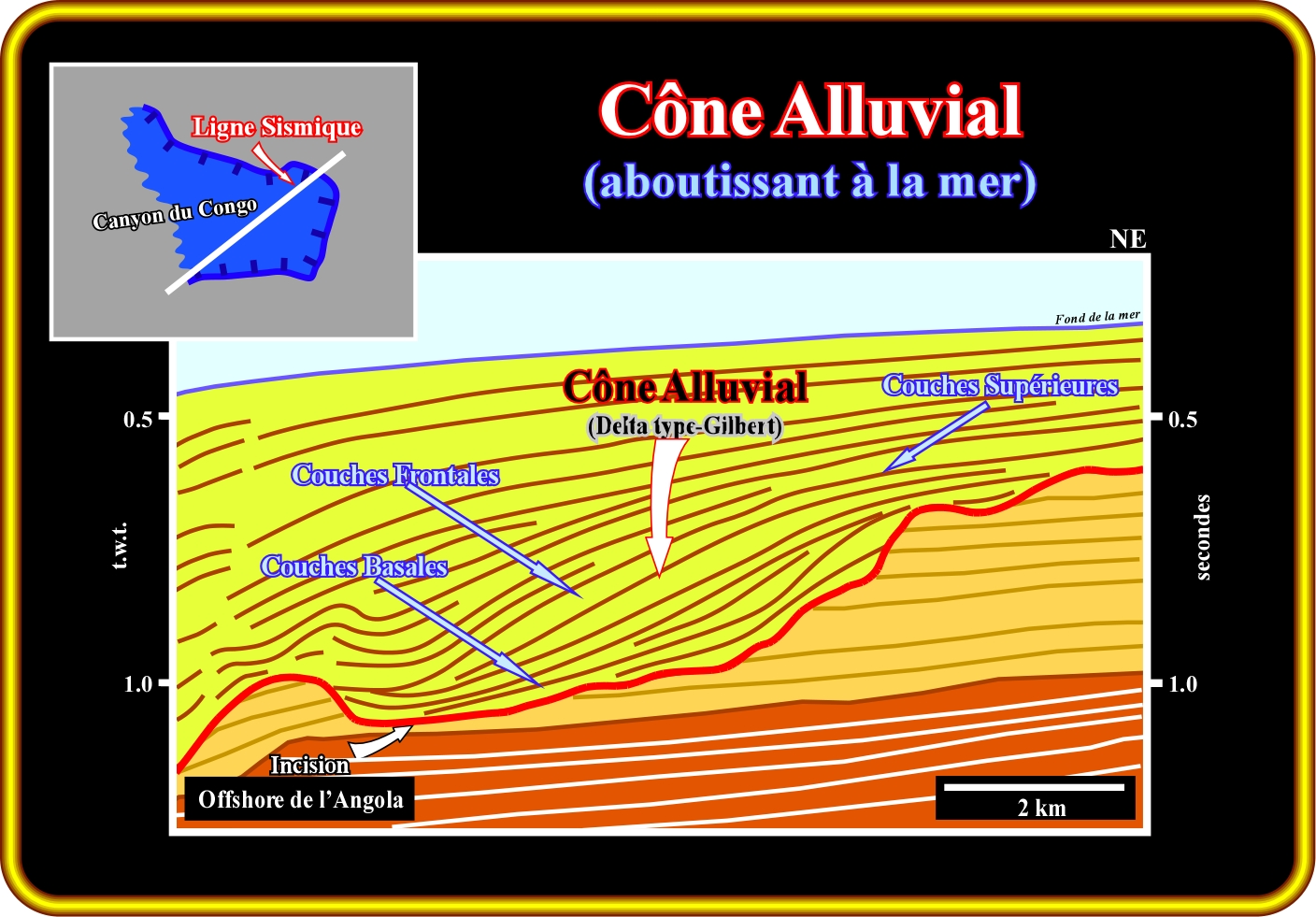 Comme l'illustré dans cette tentative d’interprétation géologique d'une ligne sismique de l'offshore de l'Angola, l'influence des dépôts fluviaux dans les dépôts d'eau profonde est suggérée par la configuration de certains réflecteurs sismiques, à partir desquels, la plupart des géoscientistes reconnaissent un delta alluvial ou delta type-Gilbert. La surface d'érosion (en rouge), c'est-à-dire, la discordance marque la limite entre deux cycles stratigraphiques. Cette surface d'érosion qui est reconnue par la troncature des réflecteurs sous-jacents et, également, par les biseaux d'aggravation et progradation qui caractérisent les terminaisons des réflecteurs sus-jacents, a été induite par une chute relative du niveau de la mer, probablement, en association avec le soulèvement du Sud-Ouest africain (dans la région du bassin du Congo, les données sismiques suggèrent un soulèvement entre 1500 et 2000 mètres). Cette chute relative du niveau de la mer a exhumée l'ancienne plate-forme continentale (si elle existait) et, aussi, la partie supérieure des canyons sous-marins présents sur le talus continental. Ceci veut, probablement, dire qu'une grande partie de l'érosion, visible dans la partie centrale de cette interprétation, existait avant la chute relative du niveau de la mer et qu'elle aurait été faite par l'action érosive d'un canyon sous-marin. La limite supérieure de ce canyon et l'orientation de la ligne sismique, sont illustrées à droite de la figure. Ainsi, on peut peut avancer l'hypothèse que pendant la période de bas niveau marin, un courant fluvial chargé de sédiments alluviaux a entré, directement, dans la partie immergée du canyon déposant, sous une profondeur d'eau importante, un delta alluvial. La géométrie des réflecteurs qui fossilisent le canyon sous-marin (géométrie sigmoïde ou en S) est caractéristique des lignes chronostratigraphiques des appareils deltaïques, lesquels sont composées de couches basales (base du prodelta et turbidites proximales), couches frontales (prodelta et front de delta) et couches supérieures (plaine deltaïque).