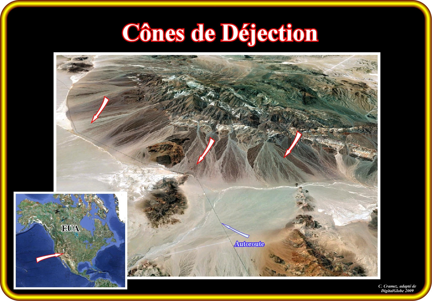 Cette photo (l'autoroute donne l'échelle) de la Vallée de la Mort, près de Badwater (USA), montre des cônes de déjections qui, comme on le voit, se composent de sédiments transportés par l'eau et déposés sous la forme d'éventails. Dans ce cas particulier, les cônes de déjection se forment à l'embouchure de vallées ou de petits canyon continentaux, et sur certains aspects peuvent être considérés comme la contrepartie de deltas. En général, les cônes de déjection se forment dans la base d'éléments topographiques où il y a une rupture importante d'inclinaison. Cela implique, que le plus gros sédiments se déposent dans l'apex du cône et que ses bords sont constitués par du matériel plus fin. Les cônes alluviaux sont typiques des régions arides ou semi-arides, mais nous ne pouvons pas dire qu'ils sont limités à ces type de climat. Des cônes de déjection se forment, également, dans des climats humides, comme les grands cônes de déjection du fleuve Koshi (Népal). Avec le temps, un cône de déjection est, progressivement, détruit par l'érosion, laquelle finira par égaliser le terrain. Dans les modèles géologiques de la stratigraphie séquentielle, les cônes de déjection se déposent en amont de la ligne de baie (frontière entre les dépôts fluviatiles et continentaux) où les changements relatifs du niveau de la mer n'ont presque aucun effet sur la création de l'espace disponible pour les sédiments. Cependant, comme pour certains géoscientistes, les variations du niveau de la mer contrôlent les profiles d'équilibre des courants d'eau, indirectement, elles exercent une certaine influence dans l'évolution des cônes de déjection.