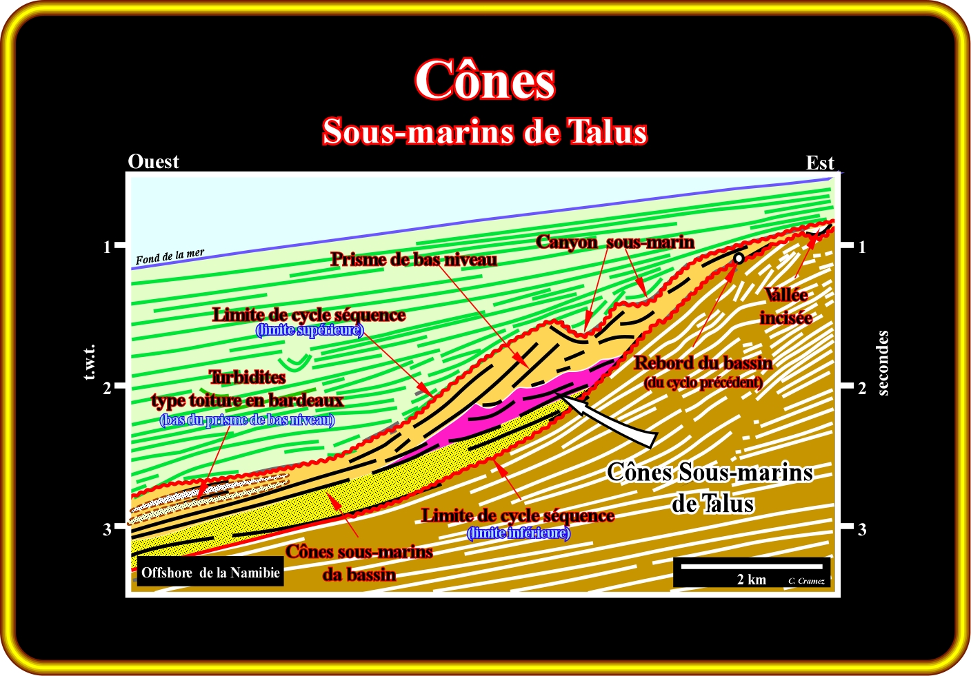 Cette figure illustre une tentative d'interprétation géologique d'une ligne sismique de l'offshore de la Namibie, dans laquelle un cycle-séquence incomplet (les cortèges de haut niveau, autrement dit, le cortège transgressif (CT) et le prisme de haut niveau (PHN) ne se sont pas déposés). En revanche, tous les membres du cortège de bas niveau (CBN) sont tous représentés, c'est-à-dire : (i) Les cônes sous-marins de bassin (CSB) ; (ii) Les cônes sous-marin de talus (CST) et (iii) Le prisme bas niveau (PBN). Les discordances que limitent ce cycle stratigraphique, dit cycle-séquence, se reconnaissent facilement par les relations géométriques entre les réflecteurs, par les terminaisons des réflecteurs et par les remplissages des vallées incisées. Les vallées incisées sont situées près des rebords du bassin définis au niveau des discordances, lesquelles ont été induites par des chutes relatives significatives du niveau de la mer. Dans cette tentative d'interprétation, le membre moyen du cortège de bas niveau (CBN), autrement dit, les cônes sous-marins de talus (CST) sont colorés en violet. Ces cônes sous-marins marquent une période d'érosion et, probablement, aussi, l'effondrement du rebord du bassin. En fait, la subsidence (tectonique) combinée avec eustasie (variations globales du niveau de mer) ont crée une chute relative du niveau de mer qui a exhumé l'ancienne plate-forme continentale (un bassin peut, éventuellement, ne pas avoir de plate-forme) en la transformant en une plaine côtière, une fois que le niveau de la mer est devenu plus bas que le rebord du bassin. Dans ces conditions, les sédiments sont transportés par des courants de turbidité vers les parties profondes du bassin, où ils se déposent formant des cônes sous-marin de bassin (CSB), que rapidement (en temps géologique) sont fossilisés par les cônes sous-marins de talus (CST), dès que le niveau relative de la mer s'est stabilisé ou a commencé à monter.