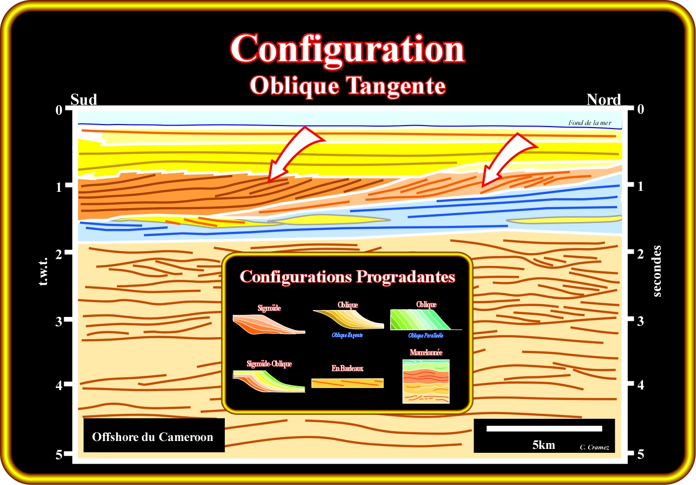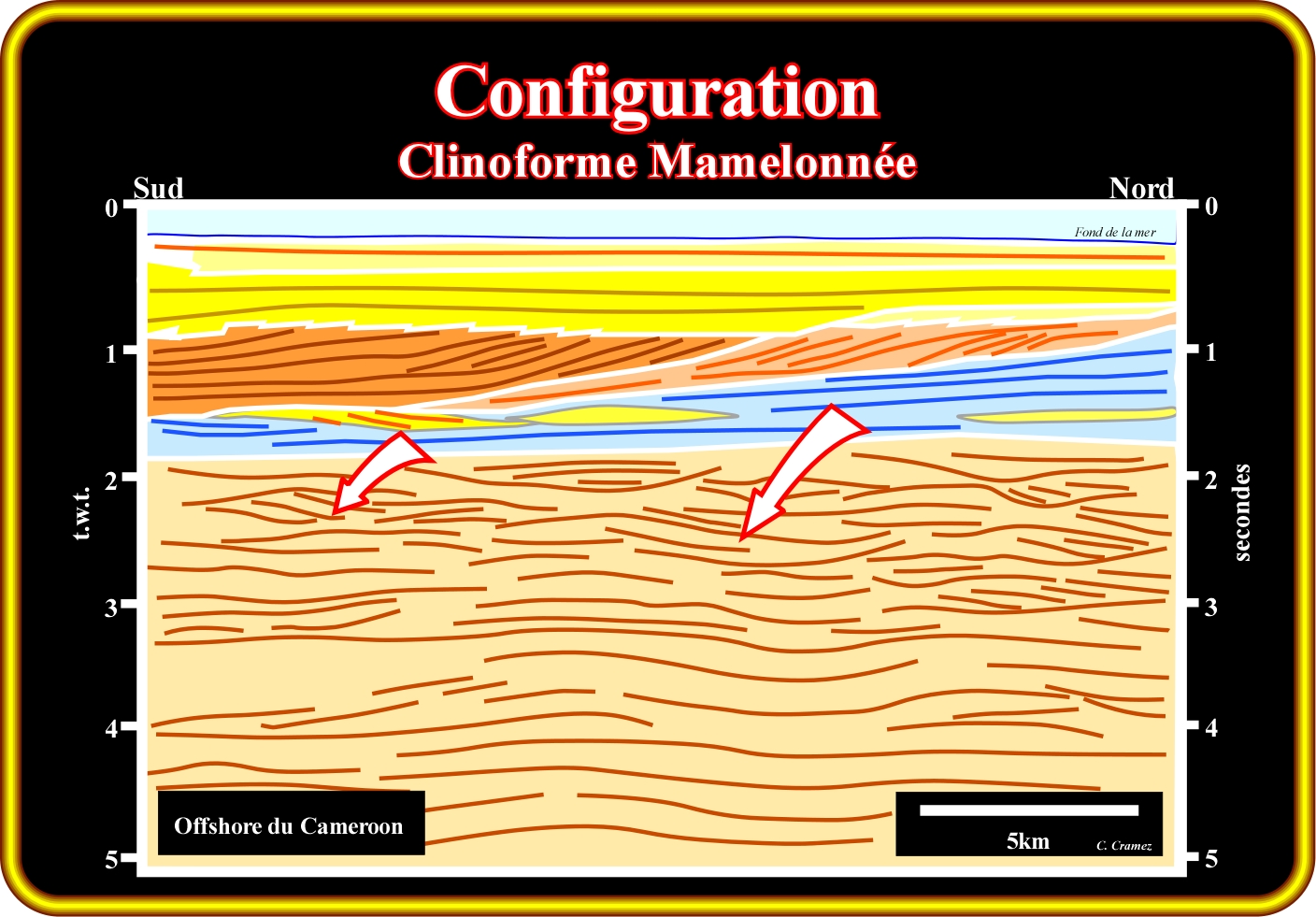 Dans cette tentative d'interprétation géologique d'une ligne sismique de l'offshore conventionnel du Cameroon, l'intervalle sédimentaire, entre 1.8 - 3.1 secondes a une configuration interne mamelonnée. Au contraire, dans les intervalles qui le limitent, dont les configurations internes sont, plus ou moins, parallèles, les réflecteurs sismiques qui inclinent soit vers le Nord soit vers le Sud, ont une géométrie, qui à première vue peut être considérée comme chaotique. Dans les années 70, la majorité des géoscientistes des compagnies pétrolières qui ont travaillé dans cet offshore cherchaient des pièges anticlinaux, ont, parfois, interprété ces clinoformes à vergence opposée comme des anticlinaux. Cependant, les structures définies par ces réflecteurs ne peuvent pas être expliquées par la tectonique (compressive ou extensive), ce qui signifie que les sédiments ne sont ni raccourci ni allongés. Il n'y a qu'un seul modèle géologique, qui peut les expliquer, autrement dit, le système de déposition des cônes sous-marins de talus. En fait, lors d’une chute relative du niveau de la mer, les biseaux d'aggradation côtiers sont déplacés vers la mer et vers le bas (aggradation négative) et l'ancienne plate-forme continentale (si elle existe) est exhumée et exposée à l'érosion. Pendant la chute relative se forment des courants turbiditiques qui transportent une grande quantité de sédiments vers les parties profondes du bassin où, évidemment, il n’y a aucun problème d'accommodation. Dès que les courants perdent de la vitesse, une partie des sédiments transportés est déposée dans les deux lobes latéraux (digues marginaux) et l'autre partie (les sédiments plus fin) est transportée vers l'aval par le courant qui passe entre les deux lobes. Les courants turbiditiques suivants utilisent la dépression entre les lobes latéraux déposés, en même temps que d’autres digues marginaux naturels se déposent sur les digues précédents et ainsi de suite. C'est cette géométrie de déposition qui dans une coupe géologique ou ligne sismique, perpendiculaire à la direction régionale de l'apport terrigène, crée une configuration clinoforme mamelonnée.