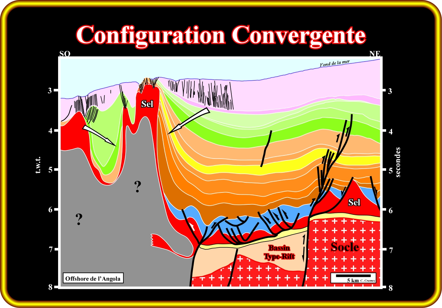 Dans cette tentative d'interprétation géologique d'une ligne sismique de l'offshore profond de l'Angola, où la tectonique salifère (halocinèse) est intense, les intervalles sédimentaires avec une configuration convergente sont prédominants. La convergence des réflecteurs, dans un intervalle sédimentaire, en direction de la mer implique, nécessairement, une divergence dans la direction du continent. Ainsi, il est important de préciser la direction de la convergence. Dans cette tentative, la convergence des réflecteurs sismiques, qui correspondent à des lignes chronostratigraphiques (plans de stratification ou interfaces entre les paquets de couches), est, presque toujours, en direction des dômes salifères de deuxième génération. En effet, au-dessus de la limite des bassins de type-rift (visible dans le bas de l'interprétation), c'est-à-dire, au-dessus de la discordance liée à la rupture de la lithosphère du Gondwana qui, ici, est mis en évidence par la base de l'intervalle jaune (en bas à droite), s'est déposé un intervalle évaporitique relativement épais (en rouge). Cet intervalle, sous l'action de son propre poids et du poids des sédiments sus-jacents, se déstabilise et s’écoulé, peu à peu, latéral et verticalement. L'écoulement latéral du sel induit une subsidence compensatoire. Dans les zones où l'épaisseur du sel a diminué, à cause de l'écoulement, elle créée, localement, plus d'espace disponible pour les sédiments, lequel une fois rempli, augmente, localement, l'épaisseur de l'intervalle sédimentaire et, naturellement, produit une configuration interne convergente en direction de la zone où l'épaisseur du sel est resté, plus ou moins, constante. De même, on peut dire que la configuration interne de l'intervalle est divergente en direction de la zone où l'épaisseur du sel a diminué. Ces configurations internes existent toujours dans les intervalles qui forment les bassins sédimentaires induites par évacuation du sel (mini-bassins), qui sont limités, tout autour, pour une structure salifère, comme illustré dans le coin supérieure gauche de cette tentative.