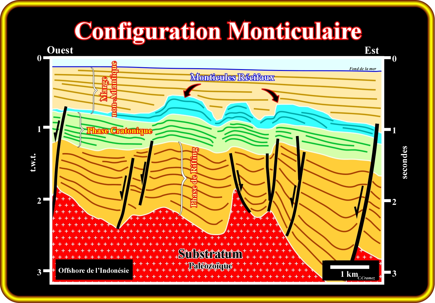 6) Monticulaire - ensemble de réflecteurs sismiques, interprétés comme des strates qui formant des anomalies topographiques ou tubercules sédimentaires au-dessus du niveau de base. Cette géométrie est typique des constructions organiques (récifs, etc.) et volcaniques. Elle peut, également, se trouvé associée à des cortèges sédimentaires turbiditiques.