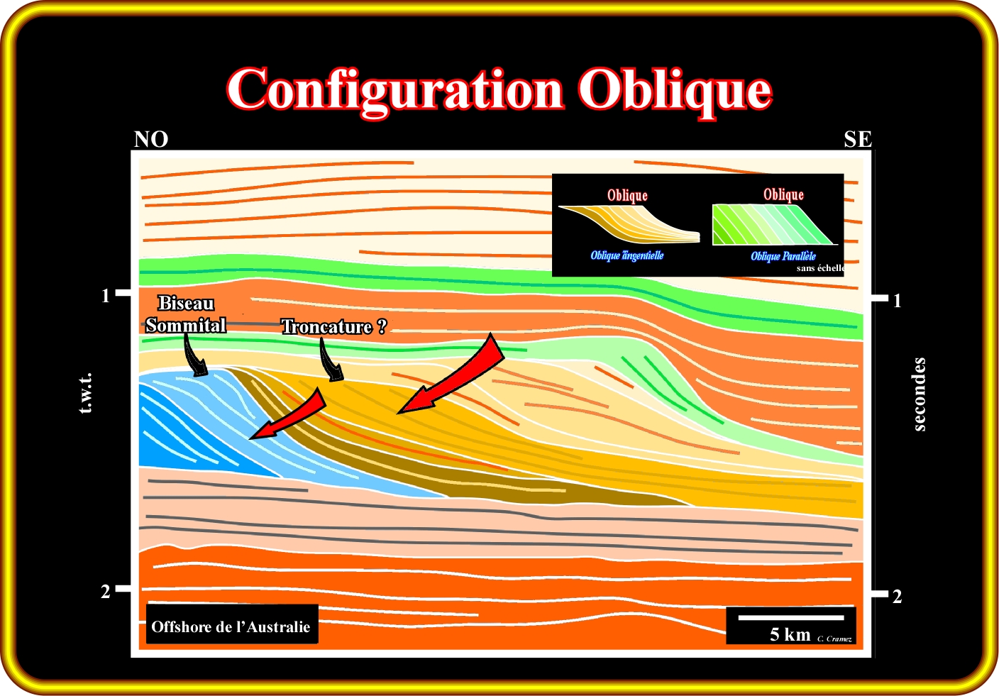 10) Oblique / Tangente - Dans cette configuration, les réflecteurs sismiques ou les strates associés, ont une inclinaison décroissante vers la base.