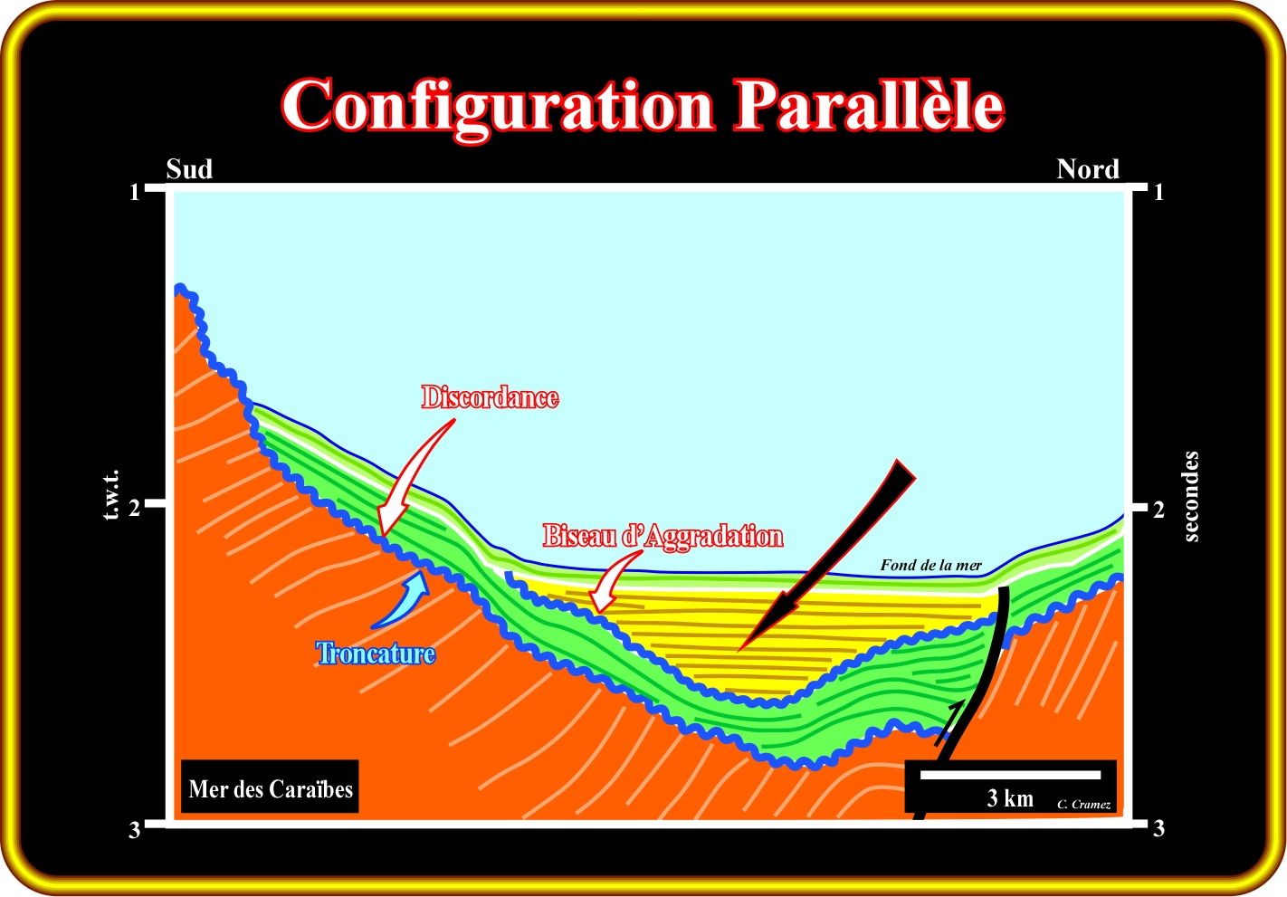 7) Parallèle - ensemble de réflecteurs sismiques interprétés comme des strates déposées parallèlement.