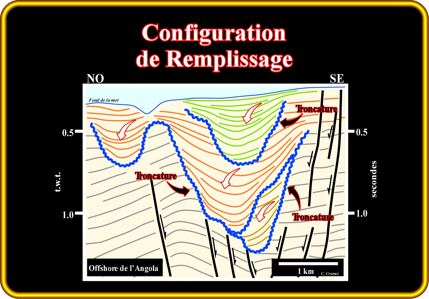 Dans cette tentative d'interprétation géologique d'un détail d'une ligne sismique de l'offshore nord de l'Angola (bassin du Congo), le remplissage des anomalies d'érosion créées par les anciens canyons sous-marins (probablement associés au canyon actuel du Congo) sont bien visibles. En fait, les successives biseaux d'aggradation, selon la direction NO-SE qui fossilisent les surfaces d'érosion sont évidents. Cependant, ces biseaux, dans une première phase, doivent être considérés comme apparents, parce que rien ne dit qu'ils existent dans la direction perpendiculaire. Dans la ligne sismique, dont la direction est NO-SE, laquelle est perpendiculaire à la direction de la ligne de côte, la configuration interne des remplissages est, apparemment, divergente vers la partie centrale des anomalies. Cependant, les relations géométriques et la configuration interne des remplissages, observées sur cette ligne, ne se vérifient pas dans les lignes perpendiculaires qui sont parallèles à l'apport terrigène. En effet, sur les lignes parallèles à l'apport terrigène, il est facile de voir que les terminaisons inférieures des réflecteurs sismiques qui remplissent les anomalie, sont des biseaux de progradation, ce qui signifie que les relations géométriques suggérées dans cette tentative d'interprétation ne sont pas réels, mais apparentes. De même, la configuration interne divergente est, également, apparente, puisque selon la direction du transport sédimentaire (le long de laquelle les relations géométriques entre les réflecteurs sont vrais) la configuration interne des remplissages est, pratiquement, parallèle. Une telle configuration suggère que le remplissage a été fait en rétrogradation, c'est-à-dire du bas vers le haut et vers l'arrière, par des biseaux d'aggradation, au fur et à mesure que le talus continental était fossilisé par des dépôts de bas ou haut niveau (des biseaux d'aggradation marins ou des biseaux d'aggradation côtiers). Notons que la position des canyons sous-marins semble avoir été, partiellement, induite par un régime tectonique extensif.