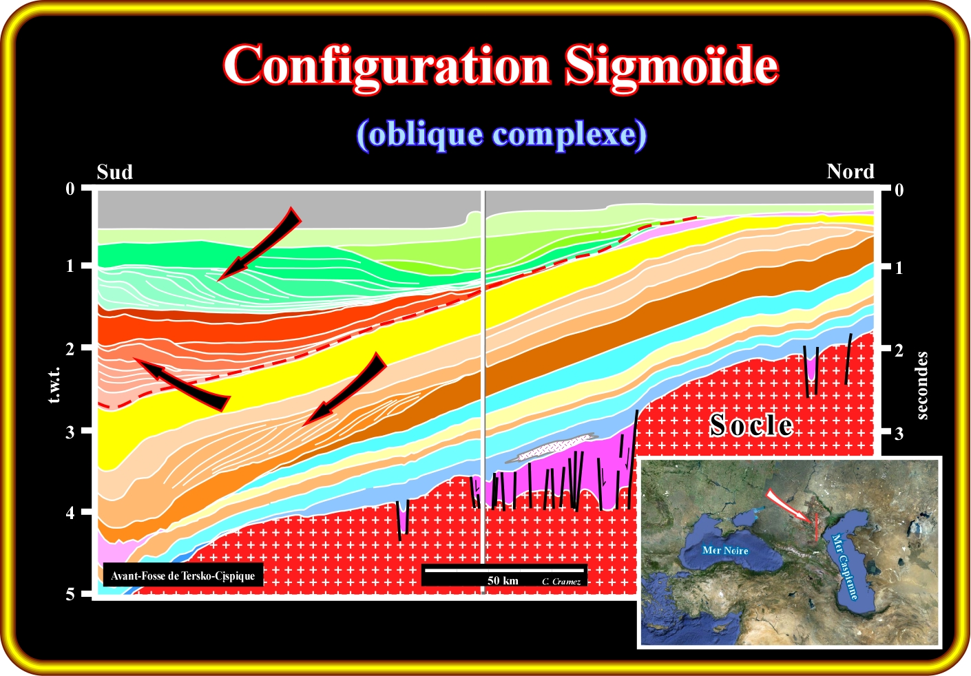 Dans cette tentative d'interprétation géologique d'une ligne sismique de l'onshore de la mer Caspienne, des progradations complexes et tangentielles obliques sont, facilement, reconnaissables. Théoriquement, ce type de progradations peut être interprété comme des surfaces clinoformes formées par l'accumulation d'un certain nombre de strates obliques que terminent, en montant, par des biseaux sommitaux (non-dépôt ou d'érosion) et, en aval (dans le sens d'une ancienne mer), par des biseaux de progradation. Certaines progradations n'ont aucune aggradation (progradations obliques pures) et, pour cela, elles terminent, en aval, de manière abrupte (pratiquement sans segment inférieur). Cela signifie que ces progradations sont composées, uniquement, par le segment oblique qui correspond, tenant compte de l'échelle, à un talus continental. Dans la stratigraphie séquentielle, on dit qu'un intervalle sédimentaire progradant a une configuration interne complexe, lorsque des progradations obliques et sigmoïdes alternent de manière, plus ou moins, désordonnée. Comme on peut le voir, dans cette tentative d'interprétation, il y a deux intervalles sédimentaires principaux avec ce type de configuration interne. Ces intervalles sont séparés par des intervalles sédimentaires d'épaisseur, plus ou moins, constante, qui ont une configuration interne parallèle (non représentée dans cette tentative). Chacun de ces intervalles progradants représente le déplacement vers le nord (intervalle supérieur) et vers le sud (intervalle inférieur) du talus continental de deux marges continentales, qui ont des polarités (inclinaison) opposées. D'autre part, dans chacun de ces intervalles, il y a plusieurs limites de cycles stratigraphiques, c'est-à-dire, plusieurs discordances induites par des descentes relatives du niveau de la mer significatives qui déplacent vers le bas et vers le large les biseaux d'aggradation côtière (aggradation négative). La mer entre les deux marges continentales a disparu, autrement dit, elle s'est fermée, peu à peu, au fur et à mesure que les deux marges continentales (plaques lithosphériques différentes) se sont approchées l'une de l'autre. Finalement, lorsque les deux plaques entrent en collision (sans énergie cinétique associée), la mer (certainement, la Mer de Téthys) s'est fermée complètement.