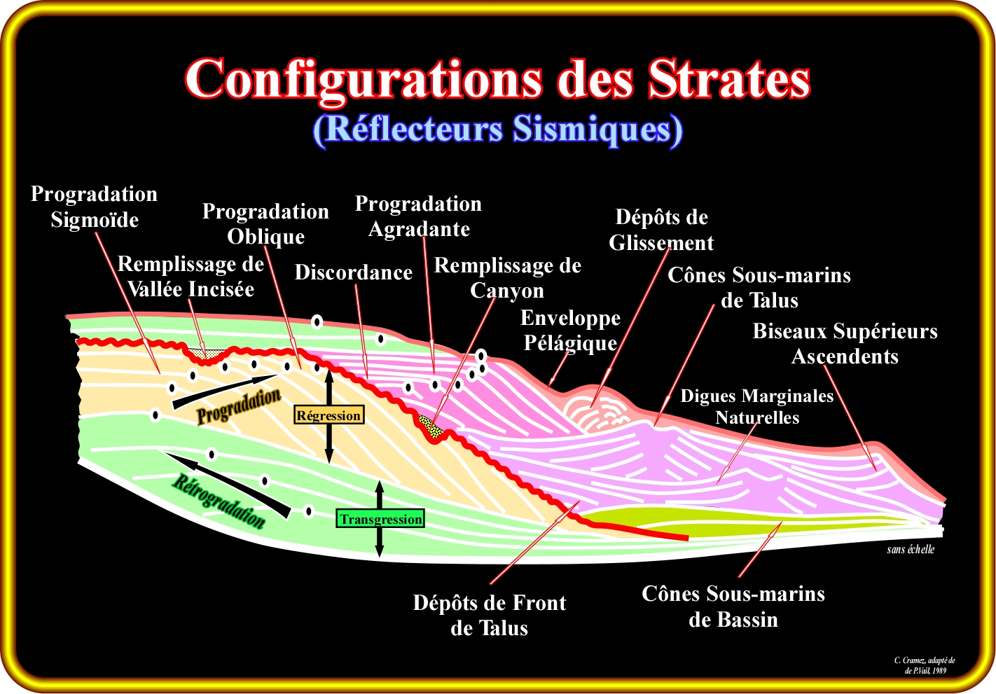Relations géométriques entre les réflecteurs sismiques, interprétées comme des strates ou groupe strates responsables des réflexions. La géométrie des réflecteurs sismiques peut être très variée. Les configurations des réflecteurs le plus fréquemment rencontrées sur les lignes sismiques sont: