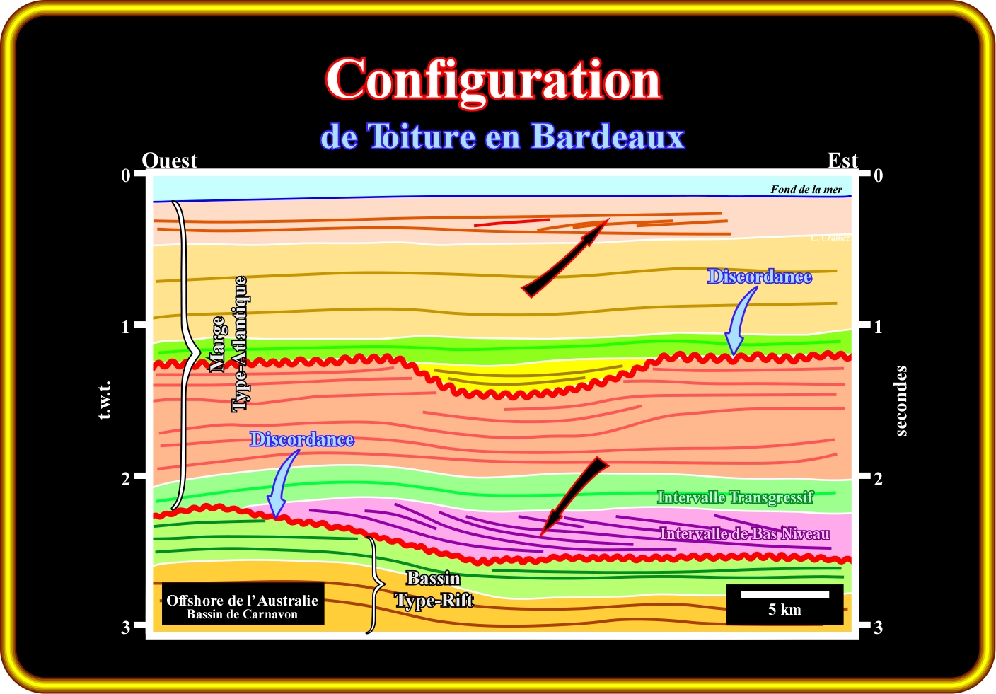Conforme..............................................................................................................................................................................................................................ConformableDans cette tentative d'interprétation géologique d'une ligne sismique de l'offshore ouest de l'Australie, les configurations internes avec la géométrie d'une toiture en bardeaux existent en deux intervalles, un desquels correspond, probablement, à des dépôts turbiditiques profonds et l'autre les dépôts deltaïques. En réalité, cet offshore correspond à l'empilement de deux types de bassins sédimentaires : (i) Bassins de type-rift (généralement des demi-grabens) développés au cours d'une phase de rifting (phase d'extension caractérisée par une subsidence différentielle) et (ii) Une marge continentale divergente du type-Atlantique développée par une subsidence thermique et constituée par une phase transgressive basale, laquelle est fossilisé par une phase régressive supérieure. La discordance associée à la rupture de la lithosphère (limite entre les bassins de type-rift et la marge divergente) est la discordance inférieure. La discordance supérieure est une discordance interne à la phase régressive. Elle ne correspond pas à la discordance qui sépare la phase transgressive et régressive, laquelle, probablement, correspond au sommet de l'intervalle vert, qui a fossilisé la vallée incisée ou canyon sous-marin qui souligne la discordance pointée à 1.2 secondes (t.w.t.). À la base de la phase transgressive, au-dessus de la discordance associée à la rupture du Gondwana (2.3-2.6 s), en conditions géologiques de bas niveau de la mer, s'est déposé un intervalle avec une configuration interne qui peut être considéré comme de toiture en bardeaux. Cet intervalle a été traversé par un puits d'exploration qui a corroboré la présence de roches-réservoir dans les lobes turbiditiques dans le segment basal des progradations du prisme de bas niveau. Dans l'intervalle supérieur, proche du fond de la mer, la configuration interne de toiture en bardeaux est plus typique, non seulement parce que l'intervalle est moins épais, mais aussi parce les progradations sont plus obliques. Le faciès est sableux et, probablement, il correspond à des cordons littoraux d'un delta développé en association avec les vagues de la mer (ou d'un lac).