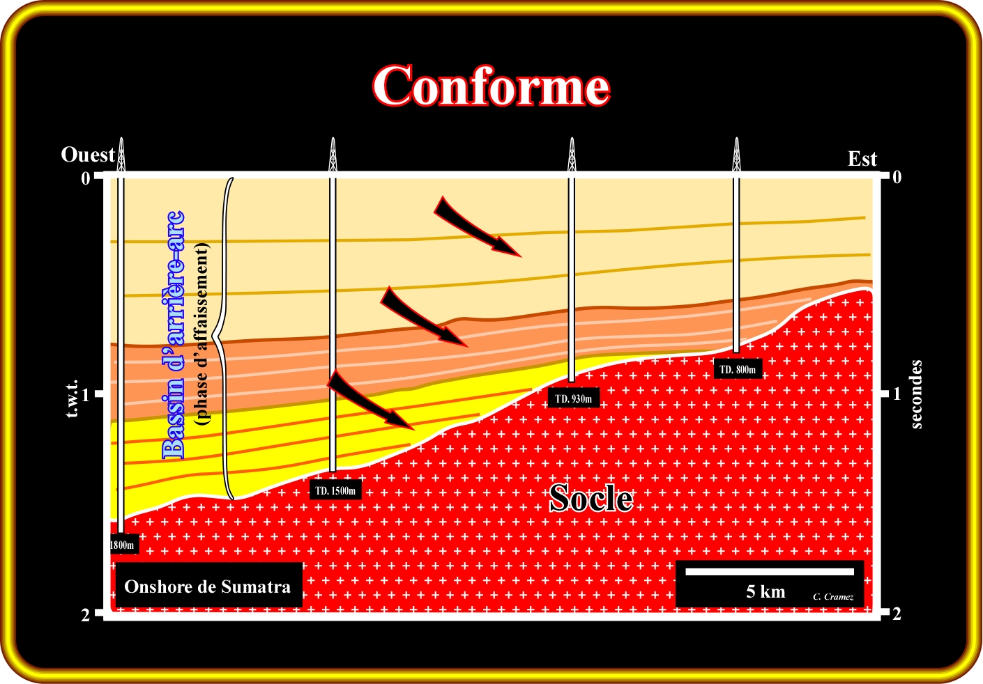 Dans cette tentative d'interprétation géologique d'une ligne sismique de l'onshore de Sumatra (Indonésie) qui correspond à un bassin d'arrière-arc, les trois intervalles sédimentaires déposés au-dessus du socle (granite-gneiss ou chaîne plissée paléozoïque) ont une configuration interne parallèle. Ce type de configuration suggère, fortement, que les sédiments qui la caractérisent, ont été déposés soit sur la plate-forme continentale (profondeur d'eau de dépôts inférieure 200 m) soit sous eau profonde. Sachant que le socle affleure à l'Est de la ligne sismique, le plus probable soit que ces trois intervalles sédimentaires aient été déposés en eau peu profonde. En fait, les lignes sismiques dans le prolongement ouest de cette tentative suggèrent la présence de talus continentaux. Tenant compte des configurations internes de ces trois intervalles, les limites entre eux correspondent à discordances (chutes relatives du niveau de la mer), c'est-à-dire, à des surfaces d'érosion. En fait, quand une discordance n'est pas renforcée par la tectonique, elle, autrement dit, la surface d'érosion, est uniquement évidente au voisinage du rebord continental, qu'il soit ou non coïncidant avec le rebord du bassin, où se développent les canyons sous-marins lors des chutes relatives du niveau de la mer. Dans les lignes sismiques, en amont du rebord du bassin qui, parfois, correspond à la limite entre le talus et la plate-forme continentale, les surfaces d'érosion se reconnaissent, uniquement, lorsque des vallées incisées sont présentes. Dans cette tentative d'interprétation, les limites entre les intervalles considérés (sous-cycles d'empiétement continental) sont conformes. Latéralement, ces limites corrèlent avec des discordances (canyons sous-marins et les biseaux d'aggradation) que l'interprétateur a reconnu ou par l'évidence de vallées incisées (non visible dans cette tentative). Dans la stratigraphie séquentielle qui est basée sur l'identification et cartographie des discordances, l'étude des relations géométriques entre les réflecteurs au voisinage du rebord du bassin est primordiale. Les lignes sismiques qui montrent les talus continentaux des différents intervalles sédimentaires sont celles qui permettent une interprétation plus cohérente.