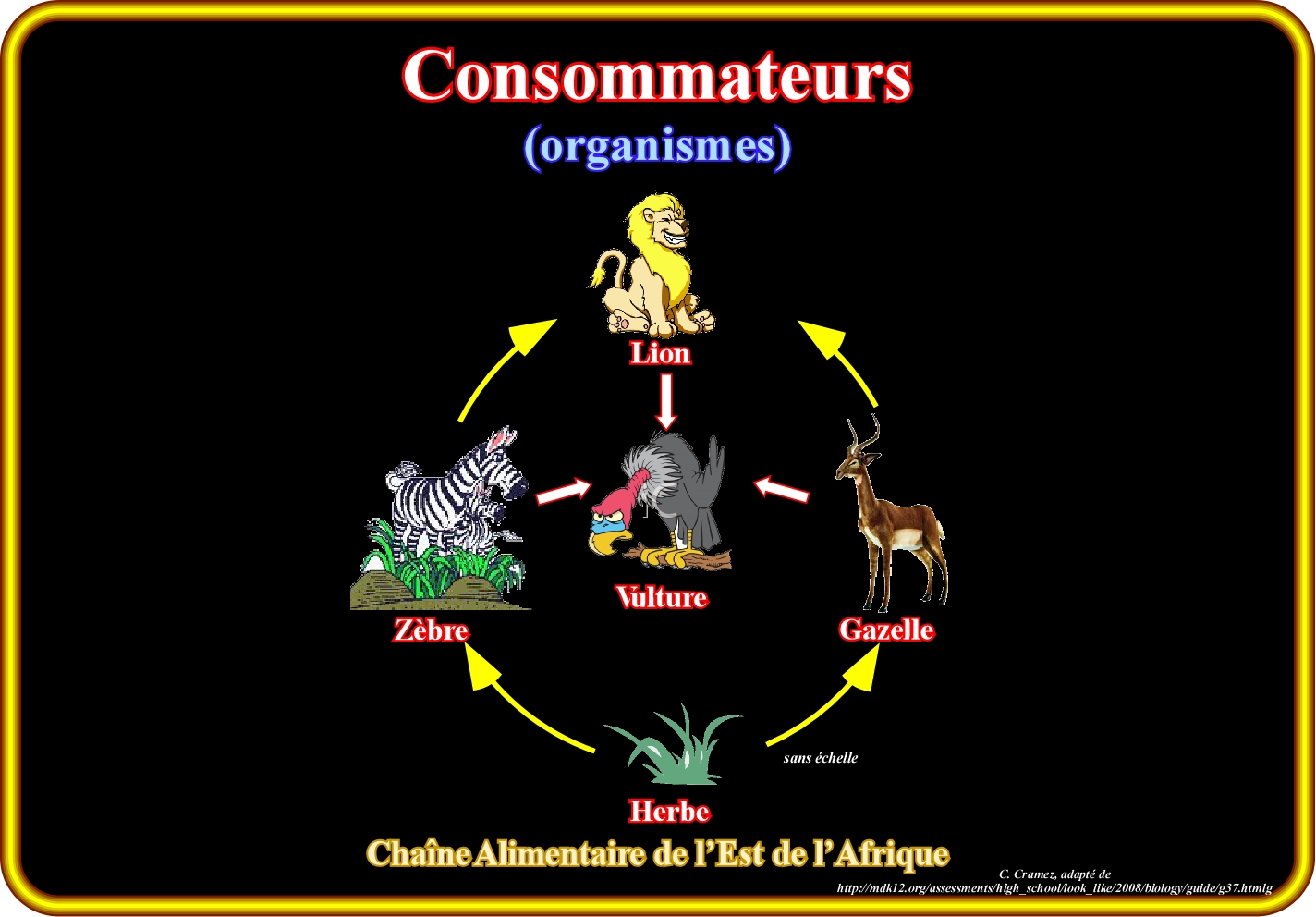 Les organisations consommateurs, contrairement aux autotrophes (qui produisent des composés organiques complexes, tels que des graisses, glucides, protéines, etc., à partir de simples molécules inorganiques en utilisant l'énergie de la de lumière ou des réactions chimiques inorganique) sont hétérotrophes, c'est-à-dire, utilisent le carbone organique dans son développement, mangeant autres hétérotrophes ou autotrophes. En d'autres termes, les organismes consommateurs décomposent les composés organiques complexes produits par les autotrophes qui sont, évidement, des producteurs. Dans le schéma représenté sur cette figure, il y a des producteurs, consommateurs et décomposeurs (êtres vivants tels que certaines bactéries et champignons qui attaquent les cadavres, excréments, restes de plantes et, en général, la matière organique dispersée dans le substratum, la décomposant en minéraux, eau et CO_2, qui sont, ensuite, réutilisées par les producteurs dans un processus naturel de recyclage). Ainsi, les herbes sont producteurs et tous les autres sont consommateurs. Toutefois, les zèbres et gazelles sont des consommateurs herbivores primaires, tandis que le lion est un consommateur carnivore secondaire et vautour est, avant tout, un décomposeur. Notons, également, que dans ce schéma il y a une relation prédateur - proie en chaque niveau trophique de la chaîne alimentaire (le niveau trophique d'un organisme est la position qu'il occupe dans la chaîne alimentaire), comme : herbe - gazelle ; herbe - zèbre ; gazelle - le lion ; zèbre - lion ; lion - vautour. Cette chaîne alimentaire peut être représentée par une pyramide à quatre niveaux trophiques : (i) À la base, l'herbe ; (ii) Dans le deuxième niveau, les zèbres et gazelles ; (iii) Dans le troisième, le lion et (v) Au sommet, le vautour. Cette pyramide montre comment l'énergie est répartie entre chaque niveau trophique. L'herbe représente le niveau le lus énergétique, tandis que le vautour représente le moins énergétique. En fait, uniquement, environ 10% de l'énergie d'un organisme passe au niveau trophique suivant. Environ 90% de l'énergie est utilisée par l'organisme ou libérée dans l'environnement. Dans une communauté saine, les producteurs représentent la plus grande population, tandis que la population des décomposeurs est la plus petite.