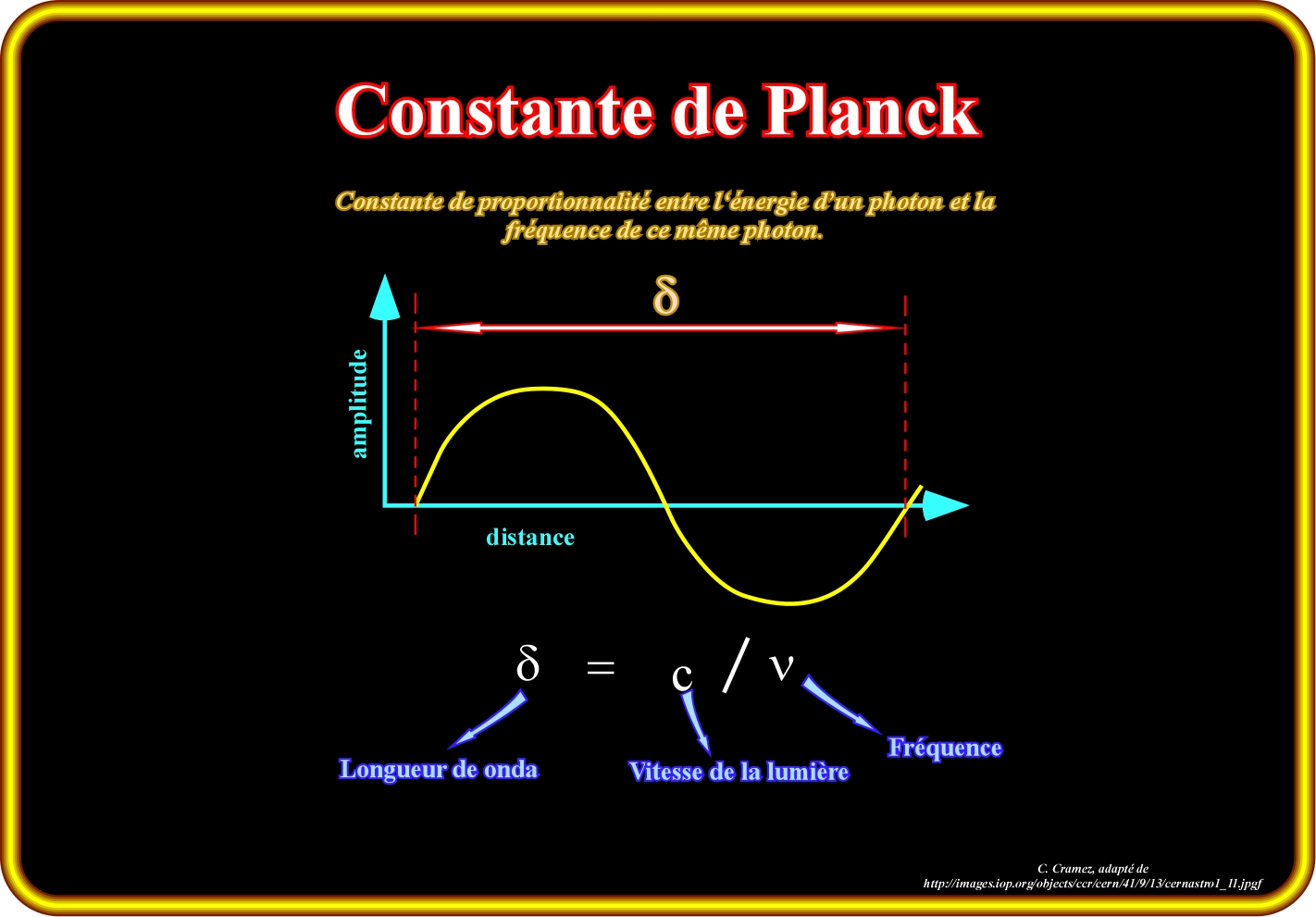 Constant physique (6.626068 × 10^-34 kg m^2/s) utilisé pour décrire la taille des quanta dans la mécanique quantique. C'est la constante de proportionnalité entre l'énergie d'un photon et la fréquence de ce même photon.