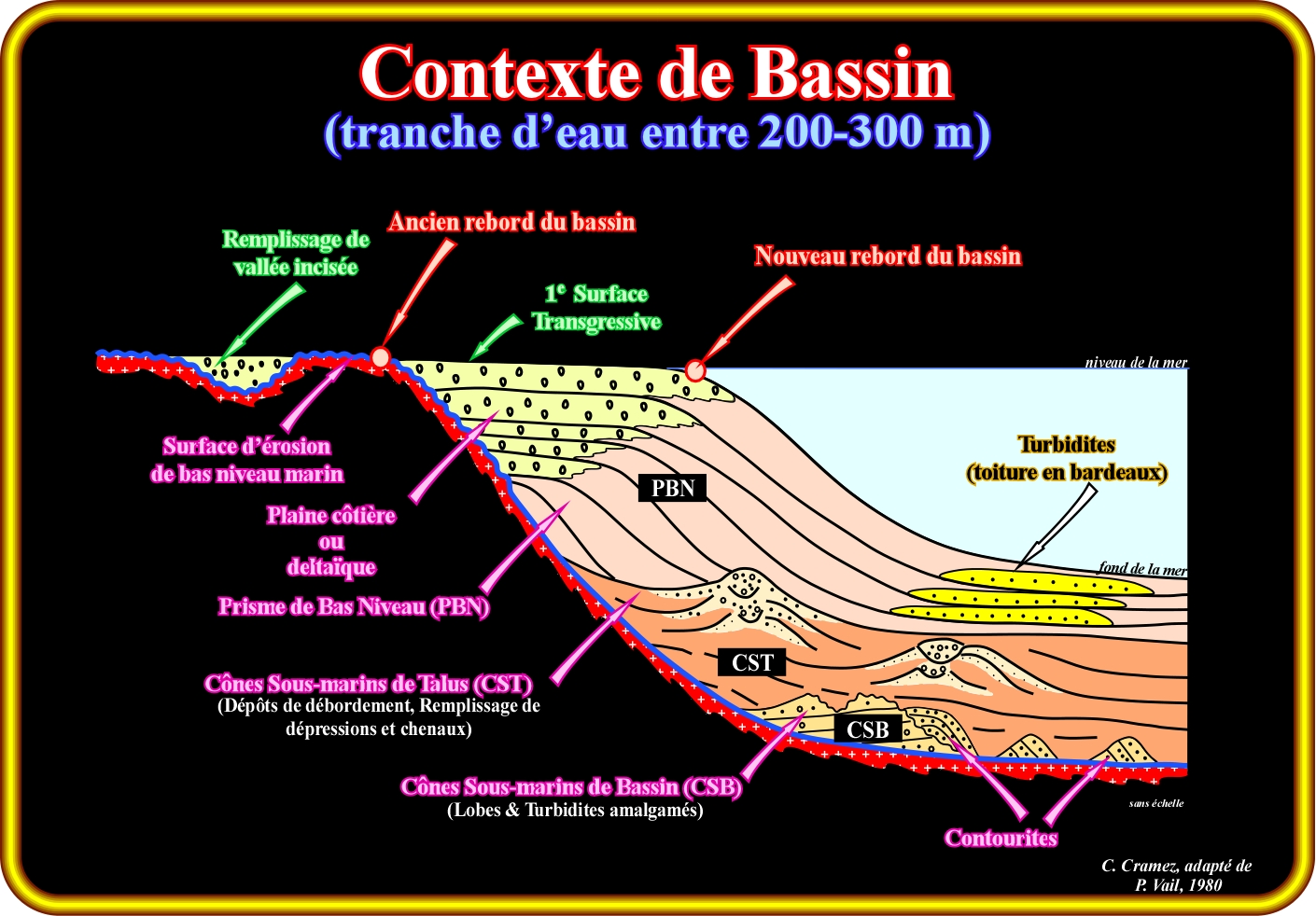 Dans le contexte géologique de bassin, le passage de la plaine côtière (ou de la plate-forme quand celle-ci existe) pour la plaine abyssale se fait par un talus continental abrupt, ce qui signifie que la limite entre la plaine côtière et le bassin est bien marquée, soit dans les prismes de haut niveau, soit par le cortège de bas niveau. Pendant le cortège de bas niveau (CBN), le bassin n'a pas de plate-forme (ou elle est très réduite) et le rebord du bassin est le rebord de l'ancien cycle sédimentaire. Le cortège de bas niveau (CBN), comme illustré ci-dessus, est composé de trois membres : (1) Cônes Sous-marin de Bassin (CSB) ; (2) Cônes Sous-marin de Talus (CST), avec complexes chenaux-digues marginales naturelles ("mouette ailes") et (3) Prisme de Bas Niveau (PBN), parfois, avec des turbidites dans la base des progradations (turbidites avec une géométrie de toiture en bardeaux). Les vallées incisées (ou creusées) créées lors de la descente du niveau relatif de la mer qui a marqué le début d'un nouveau cycle stratigraphiques, sont remplies, en général, par des sédiments, plus ou moins, grossiers pendant la montée relative du niveau de la mer, qui contrôle le dépôt de la partie supérieure du prisme de bas. À la fin du cortège de bas niveau, lors de la première surface d'inondation (début du cortège transgressif), la limite supérieure du talus continental est le nouveau rebord du bassin. Le rebord d'un bassin peut correspondre, ou non, à la rupture d'inclinaison de la surface de déposition côtière. Tout dépend si le bassin a, ou non, une plate-forme continentale. Pendant le cortège transgressif, le rebord du bassin et le continental ne coïncident pas, une fois que le niveau de la mer monte, mais dans le prisme de haut niveau, à partir du moment que la plate-forme continentale disparaît, le contexte de bassin apparaît de nouveau.