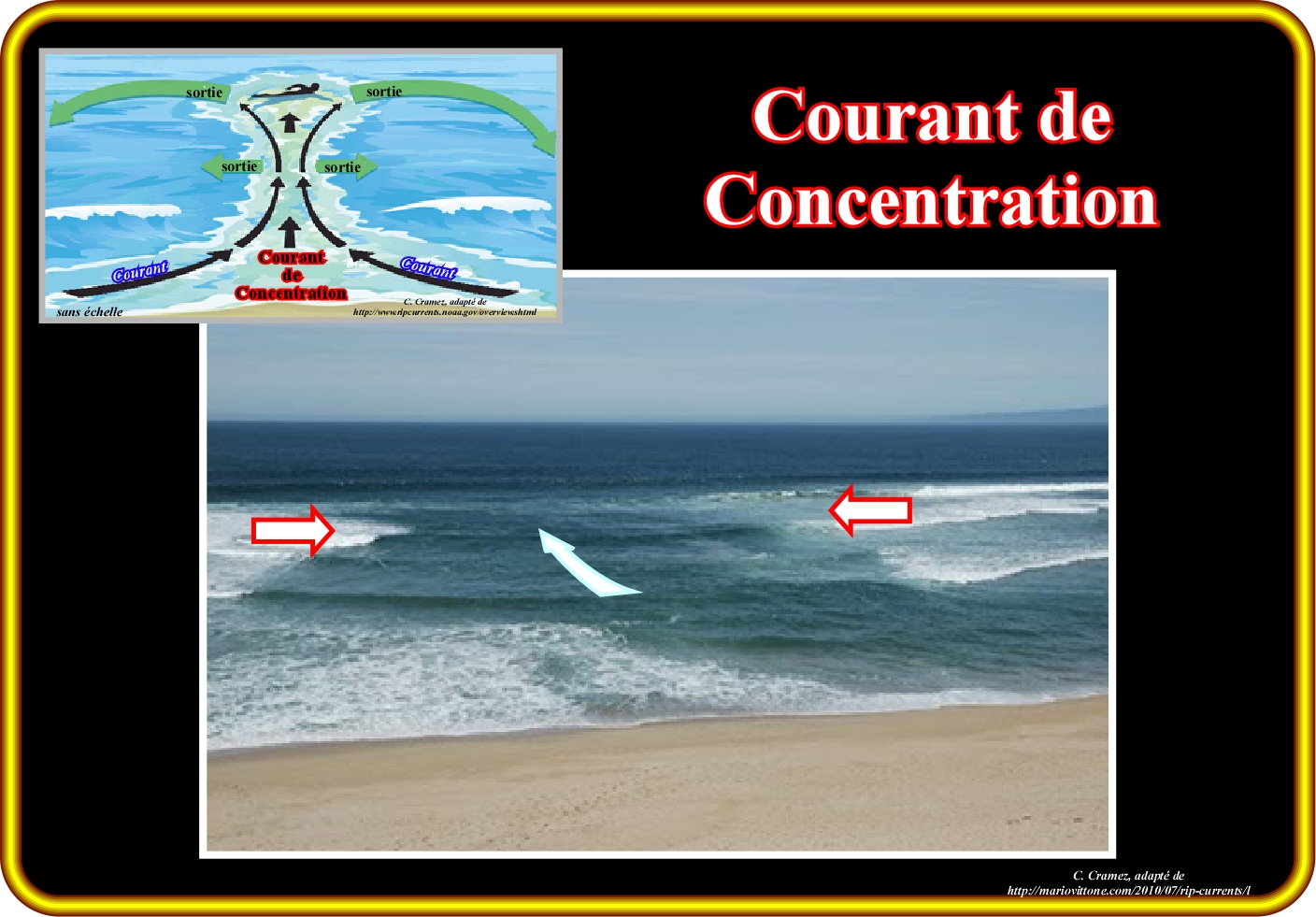 Comme l'illustré sur cette photo, un courant de concentration ou d'arrachement est un courant horizontal que ne doit pas être considéré comme un courant de retrait (courant, qui pour certains géoscientiste, s'écoule vers le large). Contrairement à une idée que beaucoup de personnes avancent, un courant de concentration ou d'arrachement ne tire pas les personnes vers fond de l'eau, mais les arrache vers le large. Des décès par noyade se produisent lorsque les personnes qui sont tirées vers le large ne sont pas en mesure de se maintenir à flotter ou de nager jusqu'au rivage, ce qui arrive, généralement due à une combinaison de : (i) Peur ; (ii) Panique ; (iii) Épuisement et (iv) Qualités de natation médiocres. Les courants de concentration sont particulièrement fréquents après les tempêtes. Certains de ces courants se produisent, uniquement, pendant quelques heures, tandis que d'autres peuvent être, plus ou moins, permanents. Pour éviter un courant de concentration ne faut pas oublier qu'il se reconnaît par : (a) Un chenal d'eau très agitée ; (b) Une zone perpendiculaire à la côte où la couleur de la mer est différent et où l'écume, des algues et des restes de plantes se déplacent rapidement vers la mer et, surtout, par (c) Une rupture dans la vague qui s'approche de la côte, comme illustré ci-dessus. D'autre part, nous ne devons pas oublier de : (1) Apprendre à nager ; (2) Jamais se baigner seul ; (3) Toujours faire attention, surtout lors de la baignade sur les plages sans surveillance et (4) Nager, dans la mesure possible, dans les plages surveillés. Si toutefois on est pris par un courant de concentration, on doit rester calme, conserver l'énergie, et ne pas essayer de lutter contre le courant. Il faut nager parallèlement à la ligne de côte pour sortir du courant (ces courants ont, rarement, une largeur excédant 10 m) et après nager vers la côte. Si on n'arrive pas à sortir du courant, il faut se laisser flotter ou nager dans le sens du courant pour en sortir et après nager tranquillement vers la côte (comme illustré dans le schéma).