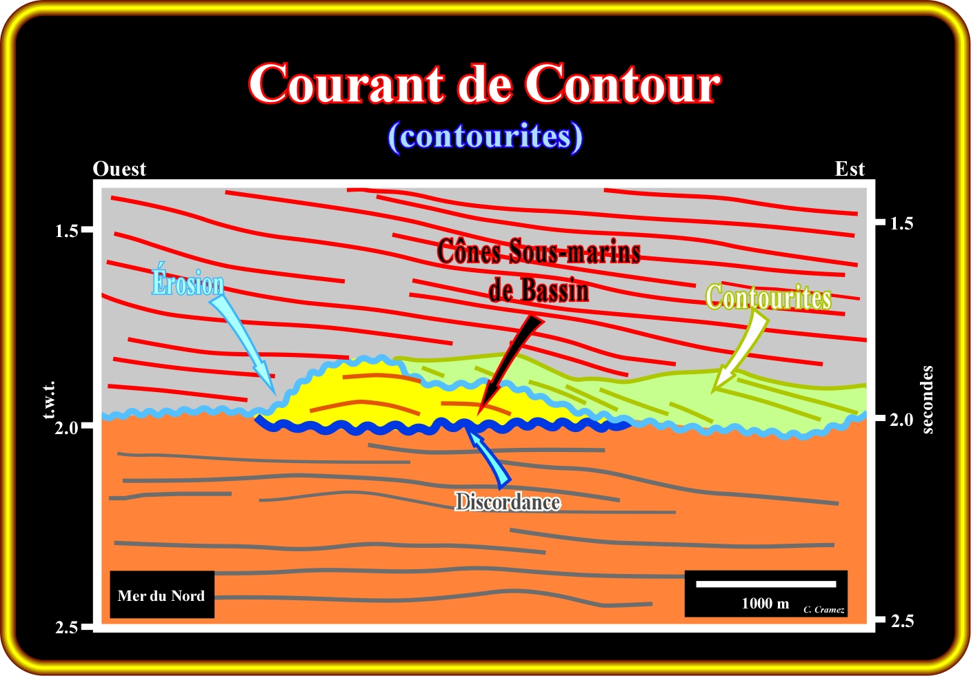 Les basses pressions atmosphériques et les courants océaniques ont tendance à soulever (± 1 m) de la surface du niveau de la mer. Au contraire, les fortes pressions atmosphériques et les courants océaniques divergents tendent à abaisser le niveau de la mer (± 1 m). L'eau qui s'écoule des hauts vers les bas ne coule pas le long de la pente maximale, mais le long des lignes de contour en raison de l'effet Coriolis. Dans cette tentative d'interprétation d'une ligne sismique de la Mer du Nord, il est probable que les courants de contour aient été les responsables de l'érosion partielle des cônes sous-marins du bassin et de la ré-déposition des sédiments érodés (contourites). La discordance de la base des cônes sous-marins du bassin est associée à une chute relative du niveau de la mer qui a exhumé l'ancienne plate-forme continentale en la transformant en une plaine côtière et qui créé une série de courants de turbidité. Ce sont ces courants qui sont responsables du dépôt de cônes sous-marins de bassin. Après le dépôt des cônes sous-marins du bassin, l'action des courants de contour qui ne s'écoulent pas le long des lignes de plus grande pente, ont érodé les cônes sous-marins de bassin (surface d'érosion en bleu clair). Les sédiments libérés ont été transportés par les courants de contour et les sédiments plus grossiers se sont déposés sous la forme de structures sédimentaires monticulaires (contourites), tandis que les particules argileuses ont continué à être transportées et dispersées le long de la base du talus continental. Les contourites se différencient des cônes sous-marins de bassin par sa configuration interne parallèles inclinée (inclinaisons de déposition supérieures à 10°). Les cônes sous-marins de bassin ont une configuration interne parallèle, mais, plus ou moins, sub-horizontale. Les contourites et les deux cônes sous-marins de bassin ont été fossilisées par des sédiments distaux du prisme de bas niveau, qui a commencé à se déposer dans la région, au fur et à mesure, que le niveau relatif de la mer ont commencé à monter.
