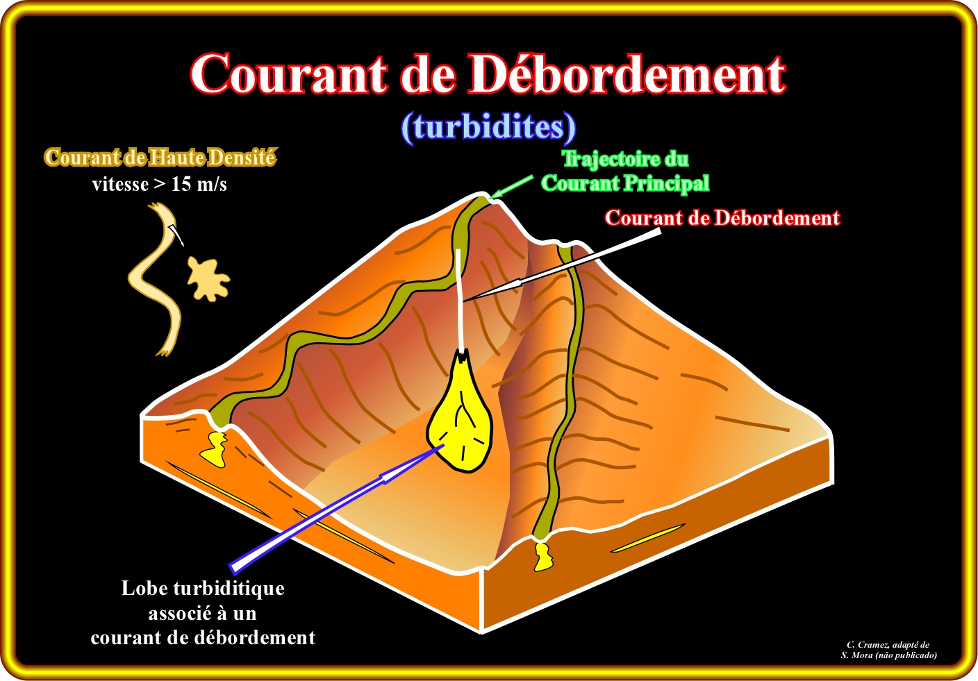 Ce schéma géologique tente d'expliquer comment se forme un courant de turbiditique de débordement. Ce type de courant se forme, surtout, dans les cônes sous-marins de talus, qui, normalement, se superposent aux cônes de sous-marins de bassin, lorsque le courant de turbiditique principal est, plus ou moins, canalisé, par le dépôts des digues marginales naturelles (dépôts de débordement). En fait, au fur et à mesure, que les dépôts de débordement se déposent, peu à peu, ils canalisent les courants turbiditiques, une fois qu'entre les digues marginales naturelles se forme une dépression centrale que les courants turbiditiques suivants utilisent pour s'écouler vers les parties plus profondes du bassin. Avec le temps et la déposition par débordement, la dépression centrale (souvent appelée chenal) devient sinueuse, une fois que la quantité de matériel sédimentaire transportée par les courants diminue. Ainsi, très souvent, il arrive que, dans la partie la plus sinueuse de la dépression, due à la forte vitesse des courants turbiditiques, la partie la plus diluée du courant s'échappe par dessus d'un confinement topographique pour déposer une partie du matériel argileux qu'elle transportait dans les zones les plus basses entre les dépôts de débordement (entre les «ailes de mouette») des cônes sous-marins de talus. Plus de courants turbiditiques s'échappent, plus le courant principal s’enrichit en sable et plus sableux seront les lobes terminaux. Les dépôts associés avec les courant turbiditiques de débordement sont très fréquents dans l'offshore de Monterey (Californie). Dans l'offshore du Brésil, en particulier dans le bassin de Campos, les lobes latéraux (comme les géoscientistes brésiliens les appellent) forment, parfois, des réservoirs et des pièges morphologiques importantes. Ces lobes, qui contrastent avec des lobes terminaux (plus riche en sable), peuvent être, localement, des bons réservoirs (dans les parties distales des cônes sous-marins de talus ou le courant turbiditique principal est plus riche en sable).