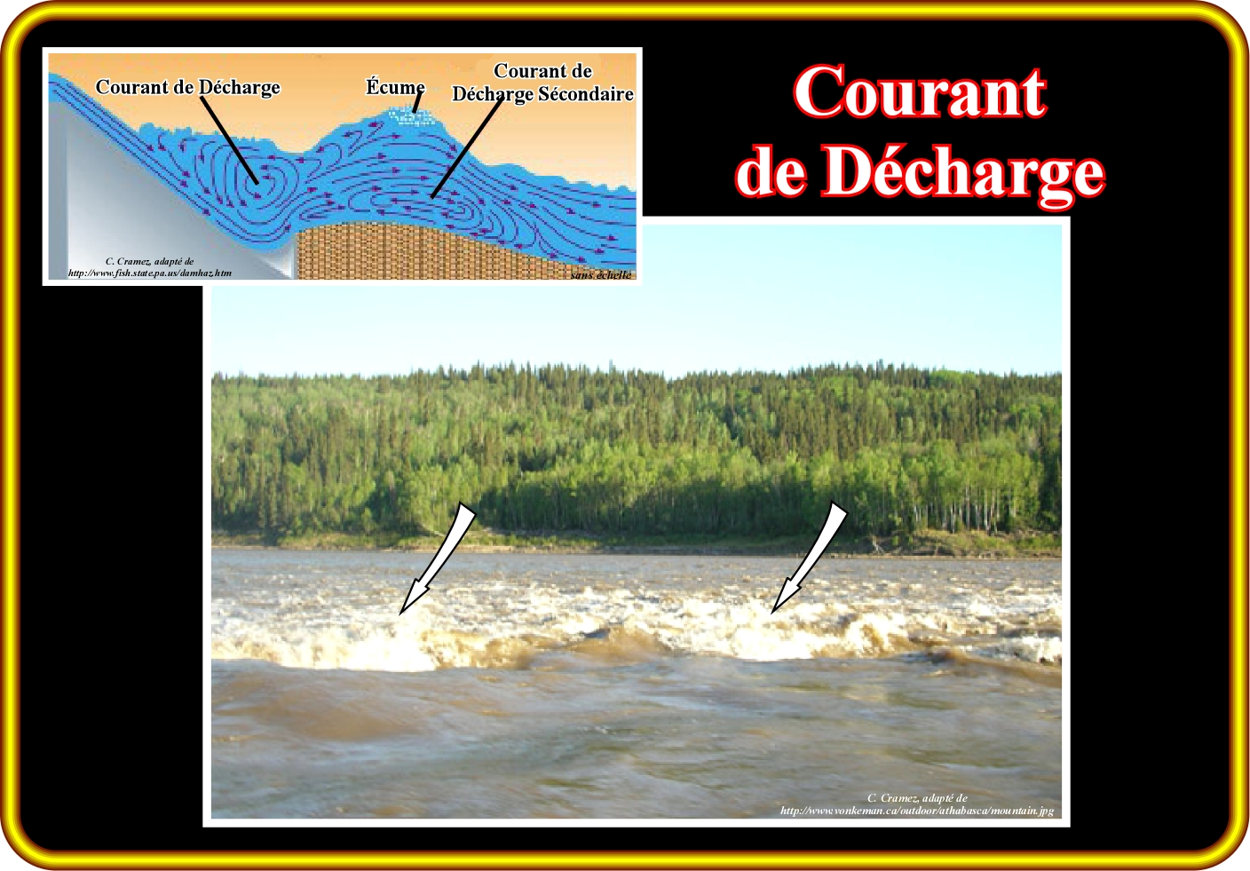 Accélération et inversion de l'écoulement d'eau sur un obstacle ou une chute. N'oublions pas qu'il ne faut jamais luter contre un courant de décharge. Au lieu de cela, il faut plonger au fond du courant et nager en toute sécurité vers la marge du courant où l'action du courant n'existe plus. Synonyme de Courant de Compensation Hydraulique.