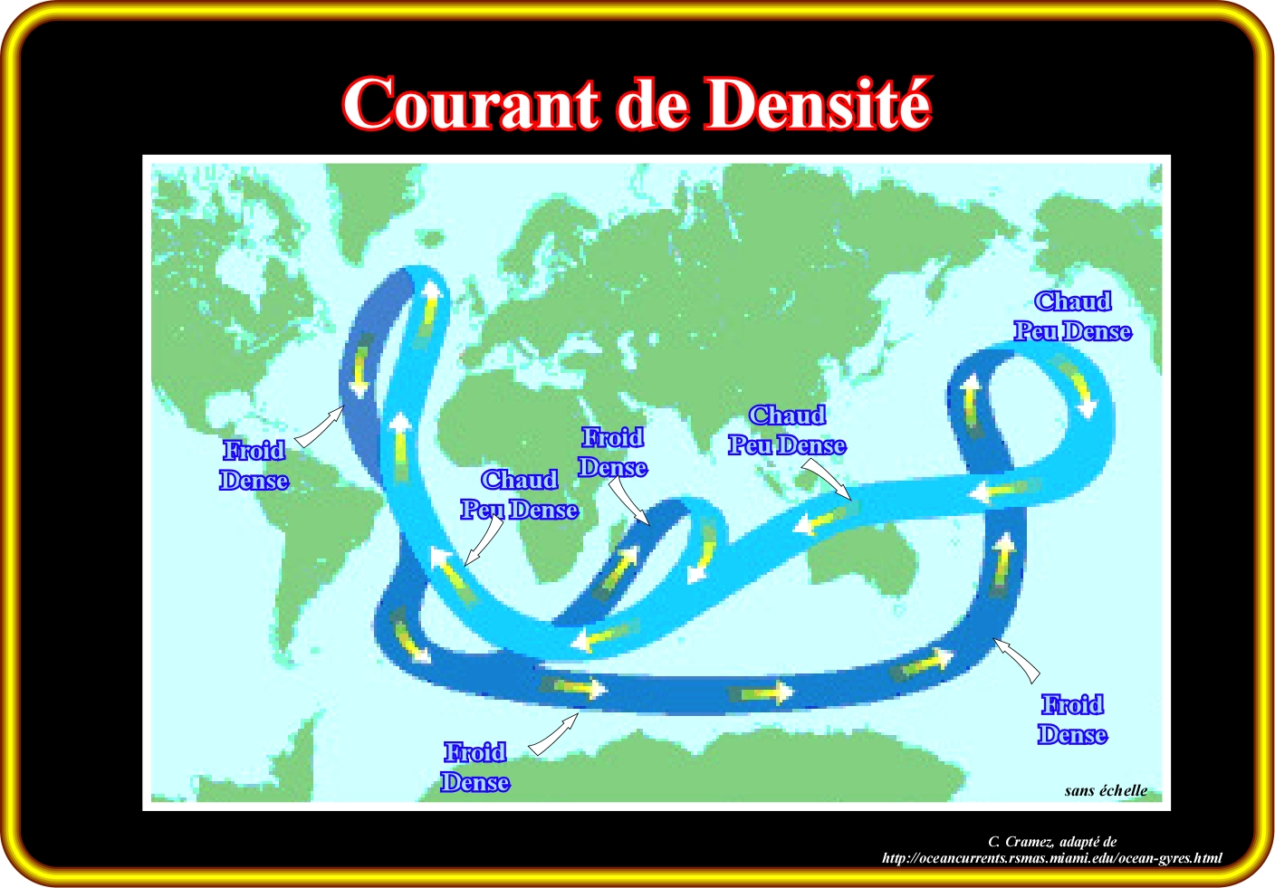 Les courants de densité (circulation thermohaline) sont causées par des différences de densité de l'eau de la mer, lesquelles sont dues, principalement, aux variations de salinité et de température. Plus grande est la salinité de l'eau de mer, plus sa densité est élevée. Deux processus, très communs, peuvent changer la salinité de l'eau de mer et, donc, sa densité : (i) Évaporation et (ii) Congélation. L'évaporation provoque une augmentation de la salinité. La congélation d'eau de mer augmente, également, la salinité. L'eau froide est plus dense que l'eau chaude, car ses molécules sont plus étroitement liées les uns contre les autres. C'est dans les régions polaires, qui se trouve l'eau plus salée, plus froide et plus dense. En Méditerranée, l'eau a une salinité de 40 parties par mille, tandis que dans l'océan Atlantique, la salinité est de 35 parties par mille. Ainsi, lorsque l'eau de la Méditerranée pénètre dans l'Atlantique via le détroit de Gibraltar, il se forme un courant de densité (non représenté sur ce schéma), car l'eau salée de la Méditerranée plonge vers le fond de l'océan Atlantique. Dans l'Atlantique Nord, l'eau profonde est liée au refroidissement de l'eau salée transporté par le courant du Golfe depuis les Caraïbes. Lorsque l'eau du courant du Golfe atteint la mer de Norvège, elle subit un refroidissement rapide. Comme elle était déjà relativement dense, en raison de sa forte salinité, le refroidissement augmente encore la densité, ce qui est, largement, suffisant pour la faire plonger dans les profondeurs du bassin océanique. Évidement, les courants de densité ont une grande influence sur le climat. Il suffit de comparer les températures hivernales des villes européens et canadiens qui ont, plus ou moins, la même latitude. En Janvier, Madrid (latitude 50° N) a une température moyenne de 5° C, tandis que la ville canadienne d'Edmonton (latitude 53° N) a une température moyenne de -15° C.