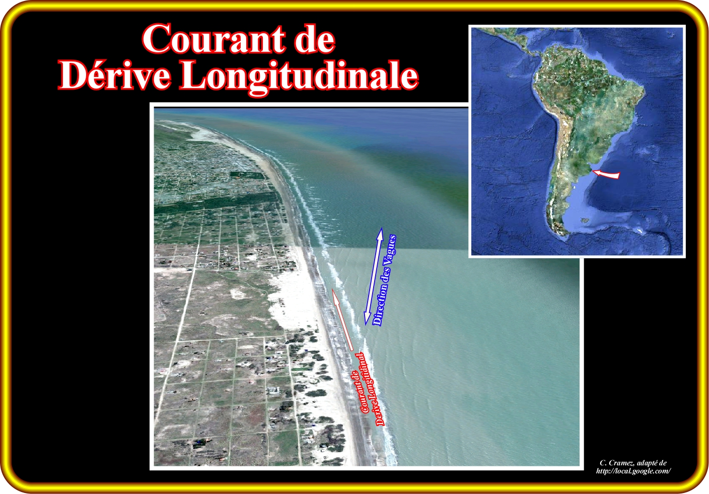 Dans cette photographie de la côte Est de l'Argentine, la direction dominante des vagues est clairement visible (perpendiculaire à la flèche bleu). L'agrégation des cordons littoraux, qui forment les successives ligne de côte, peut être expliquée comme le résultat du courant de dérive longitudinal. En fait, dès que les vagues se brisent dans la zone de déferlement, il se forme un courant en direction de l'avant plage et de la plage qui s'écoule perpendiculairement à la direction de la crête des vagues (dans le sens de la flèche bleu dessinée sur la photo), qui s'appelle courant d'afflux (l'un des deux courants de ressac). Peu à peu, ce courant montant perd de l'énergie et finalement s'inverse, autrement dit, il commence à couler vers la mer en suivant la pente du fond de la mer : c'est le deuxième courant de ressac ou courant de retrait. Ainsi, les courants d'afflux et de retrait ont, non seulement, un sens opposé, mais, également, un écoulement en directions différentes, ce qui, dans l'ensemble, produit, ce que certains géoscientistes appellent, un courant en zigzag. Le résultat final de cet courant en zigzag est la formation d'un courant, plus ou moins parallèle à la ligne de côte, qui s'appelle courant de dérive littorale, lequel est responsable de l'érosion des plages, en certains endroits, et du dépôt de sable en d'autres endroits. Il est évident que dans cet exemple, les plages sont érodées dans le sud, le long de l'agglomération de San Clemente del Tuyu, et le sable est transporté et déposé dans la partie nord, sous la forme de cordons littoraux. Souvent, pour protéger les plages du courant de la dérive littoral, les populations construisent des môles (jetées ou brise-lames) perpendiculairement à la ligne de côte. En fait, dès que ces structures de protection sont construites, la largeur de la plage de chaque côté des jetées varie beaucoup. Évidemment, que la plage plus large est du côté de la jetée qui offre une résistance au courant de dérive littoral, qui en perdant de la compétence de transport dépose des sédiments qu'il charrie. Ainsi, lorsque la direction des vagues est NO-SE, comme dans cet exemple, et la ligne de côte NNO-SSE, si une jetée est construite perpendiculairement à la ligne de côte, la plage plus large sera celle qui est au sud de la jetée.