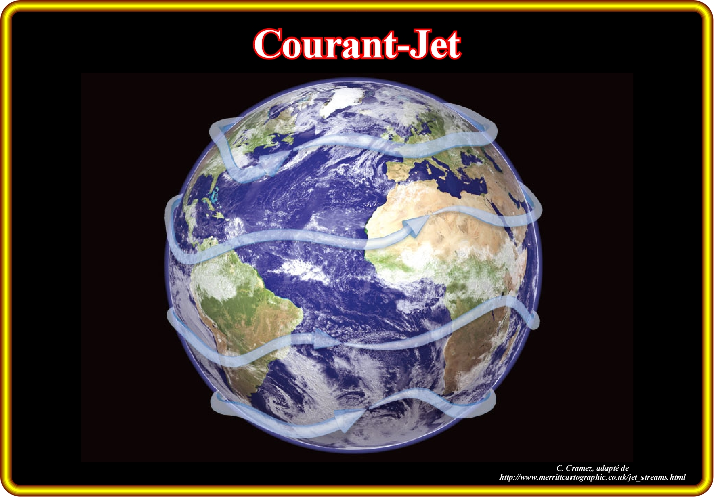 Courant d'air, relativement étroit, mais rapide qui se forme dans l'atmosphère à environ 10-12 km d'altitude, près des limites des masses d'air avec des différences de température importantes, comme entre les masses d'air polaires et les équatoriales d'air chaud. La trajectoire d'un courant-jet est méandriforme. Les méandres se déplacent vers l'Est, avec des vitesses inférieures au vent dans lequel ils se forment (Théorie de Rossby). Les courants-jets principaux se déplacent de l'Ouest vers l'Est, tant dans l'hémisphère nord ou sud.