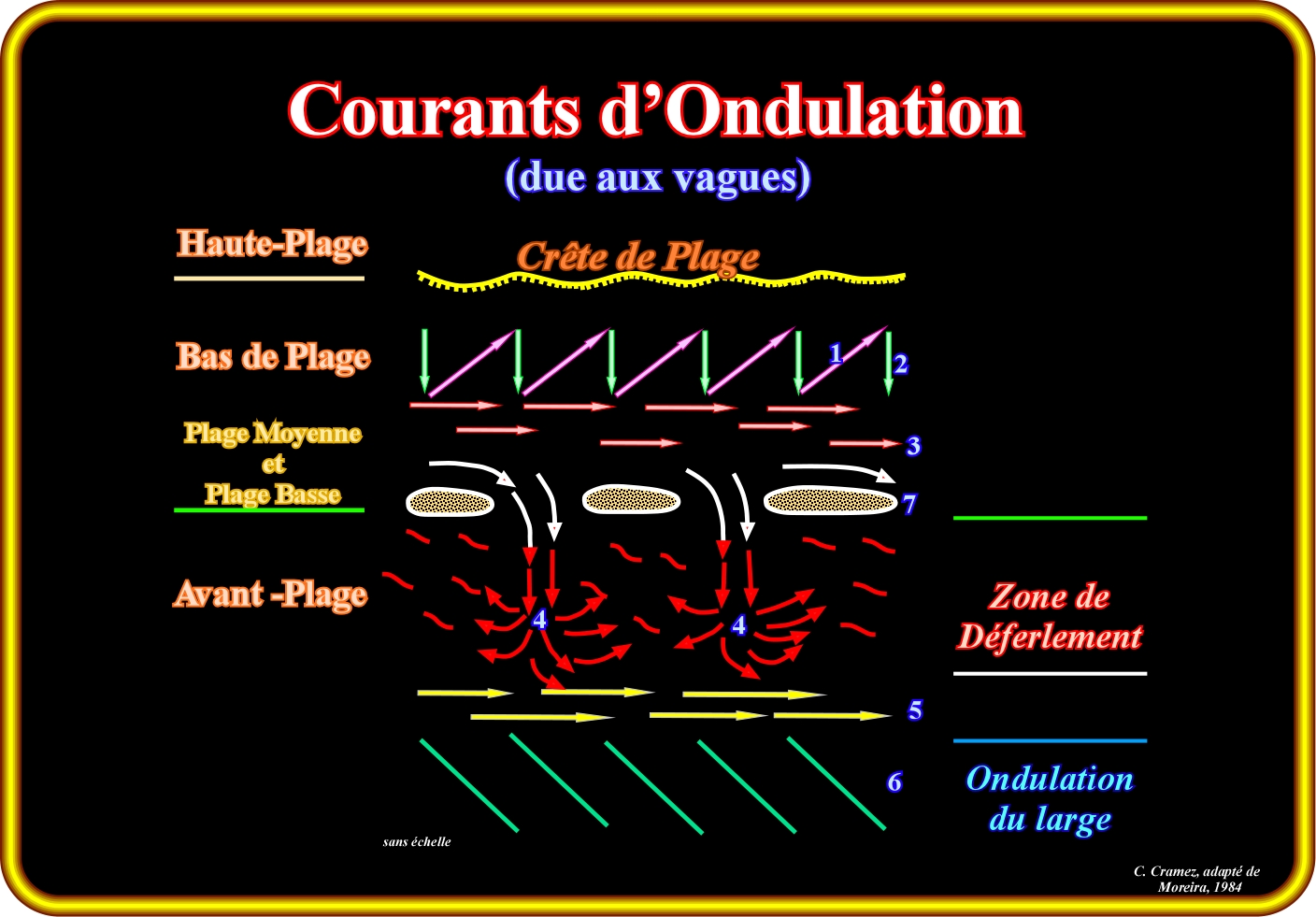 Dans ce schéma sont représentés les principaux courants d'ondulation : (1) Courant d'afflux ou jet de rive ; (2) Courant de retrait ; (3) Courant de dérive de plage ou courant en zigzag ; (4) Courant d'arrachement ; (5) Courant de dérive littoral, ainsi que la direction des vagues au large (6) et les crêtes pré-littorales (7). Les jets de rive de déferlement (ressac) ou courants d'afflux, résultent de la transformation d'une onde d'oscillation en un onde de translation ondulatoire au moment l'éclatement des vagues (déferlement). La vague de translation se propage par un courant qui se dirige vers la côte (courant d'afflux). Le courant de retrait est le courant résultant du déferlement, mais qui se dirige vers la mer, selon la pente du fond marin, dès que le courant d'afflux disparaît. En effet, il résulte de l'inversion du courant d'afflux due à la perte d'énergie provoquée par le frottement et par la pente du fond de la mer. Le courant de dérive de la plage ou en zigzag se forme sur les plages, dans la zone affectée par les courants de déferlement, en raison de l'accumulation d'eau (et sédiments) par les courants d'afflux et de retrait, quand le déferlement est oblique à la côte. Le courant de font est le courant (s'il existe) qui se déplace le long du fond marin et qui s'écoule vers le large. Le courant d'arrachement ou de concentration qui peut être perpendiculaire ou oblique à la ligne de côte, s'écoule vers le large (eau de surface et profonde). Au-delà de la zone de déferlement, le courant d'arrachement, s'ouvre, se divisant en branches qui reviennent vers le continent avec le courant d'afflux. Le courant de dérive littoral ou courant longitudinal est la masse d'eau qui coule le long de la côte, hors la zone de déferlement et qui résulte de l'accumulation de l'eau des courants d'afflux, retrait et dérive de plage, quand le déferlement est oblique à la ligne de côte.