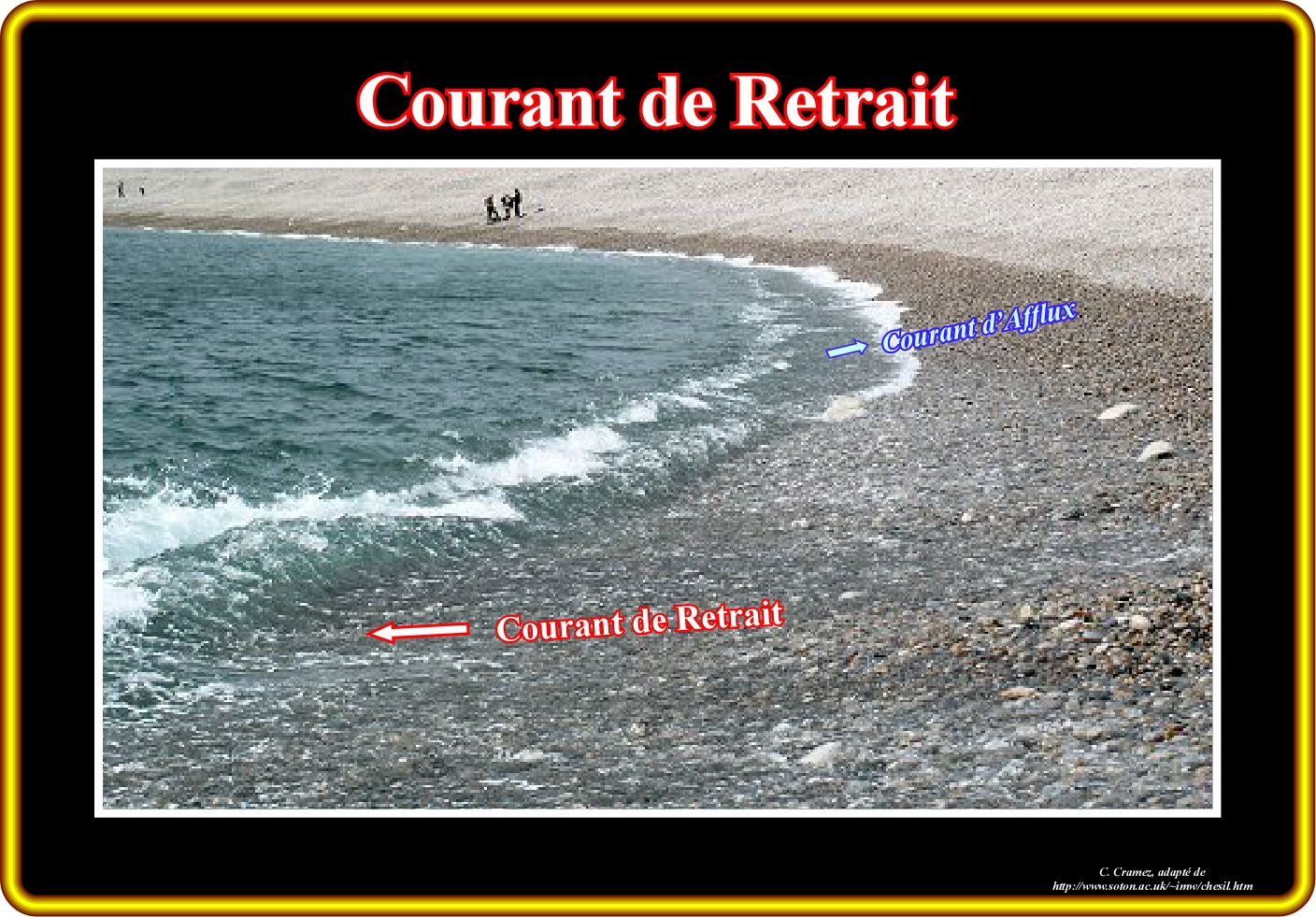 Sur cette photo, les courants de ressac ou de déferlement, autrement dit, les courants d'afflux, qui se dirigent vers la côte, et les courants de retrait qui s'écoulent vers la mer, sont facilement identifiés. Il est intéressant de noter que la direction d'écoulement des courants d'afflux est perpendiculaire à la direction des vagues (ici très petites), tandis que la direction des courants de retrait est déterminée par la pente de la plage. Il ne faut pas confondre un courant de retrait avec un courant de fond, dont l'existence est très discutée et qui est, souvent, définie comme un courant qui se déplace le long du fond de la mer et qui s'écoule vers le large. Comme dans cet exemple, le matériel qui forme la plage est grossier le courant de retrait est peu important, car il y a une percolation importante (mouvement lent et laminaire de l'eau à travers le matériel sédimentaire). C'est pourquoi l'inclinaison (pente) de la plage est, relativement, forte pour que l'équilibre entre le courant d'afflux et de retrait soit maintenu. Cette photo suggère des conditions de mer calme. Par conséquent, le courant de retrait est faible. Lorsque la hauteur des vagues est grande (fort énergie), c'est-à-dire, quand les vagues sont des destructives, les courant d'afflux sont faibles, mais les courants de retrait sont forts (pouvoir érosif important). Inversement, lorsque l'énergie et la hauteur des vagues sont petites, autrement dit, quand les vagues sont constructives, les courants d'afflux sont forts et les courant de retrait faibles. On peut dire qu'un courant de retrait se dirige vers la crête de la vague suivante et que le même mouvement orbital (mouvement d'un objet en orbite autour d'un point fixe) qui provoque la montée et la chute d'un objet qui flotte sur la mer, oblige également le creux de la vague à se déplacer en arrière et vers le haut, en direction de la prochaine crête. Ainsi, un courant de retrait n'a rien à voir avec un courant de fond (en supposant qu'il existe dans la nature). Rappelons nous que la vitesse des ondes signifie une vitesse de phase : ce qui bouge n'est pas l'eau mais les crêtes et les creux, c'est-à-dire, la phase de la surface de l'eau.