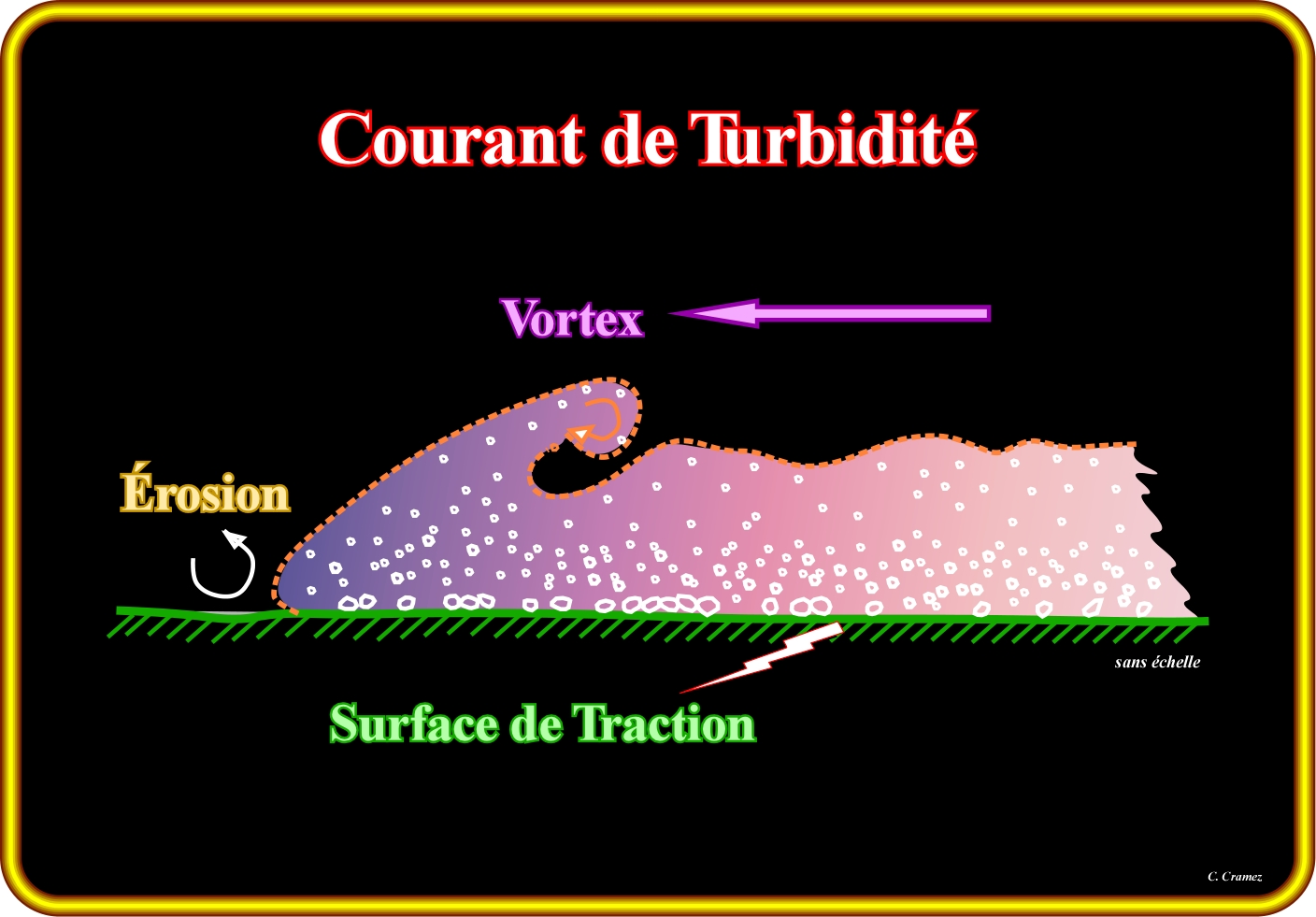 Dans un courant de turbidité, la plupart du matériel est transporté par le mécanisme illustré dans cette figure. Un courant de turbidité peut parcourir des centaines de kilomètres à une vitesse relativement importante (plusieurs dizaines de kilomètres par heure). Dans la partie frontale du courant, il y a érosion, par aspiration et déposition après le passage du courant. Les blocs de grands dimensions sont transportés dans la base du courant, par traction, tandis que les particules plus petites restent en suspension. Ces courants peuvent se former soit dans des situations géologiques de haut niveau marin (bassins avec plate-forme continentale, lorsque le niveau de la mer est au-dessus du rebord du bassin), ou dans des conditions de bas niveau marin (quand le niveau de la mer est plus bas que le bord du bassin autrement dit, quand le bassin n'a pas de plate-forme continentale). Dans le premier cas, les courants de turbidité sont formés par des glissements créées par des instabilités du rebord du bassin, lequel peut ou non coïncider avec la ligne de côte, ou lors creux des fleuves qui mènent vers la mer l'excès de sédiments qui ne peuvent être déposé sur la plate-forme ou sur la plaine côtière par manque d'espace disponible. Dans le second cas, les courants de turbidité sont associés à des chutes relatives significatives du niveau de la mer qui exhument la plate-forme continentale (si elle existe) ou la partie supérieure du talus continental. Dans ces conditions, les embouchures des rivières sont déplacées vers la mer, parfois plusieurs dizaines de kilomètres. Ainsi, tout le matériel transporté par les fleuves tombe directement sur le talus continental et sera transporté par des courants de turbidité vers les parties profondes du bassin, où il est déposé sous la forme de cônes sous-marins de bassin ou de talus. Dans le premier cas, les dépôts associés peuvent avoir différent âges, alors que dans ce dernier cas, ils sont contemporains de la chute relative du niveau de la mer, autrement dit, de la discordance de base du cycle sédimentaire.