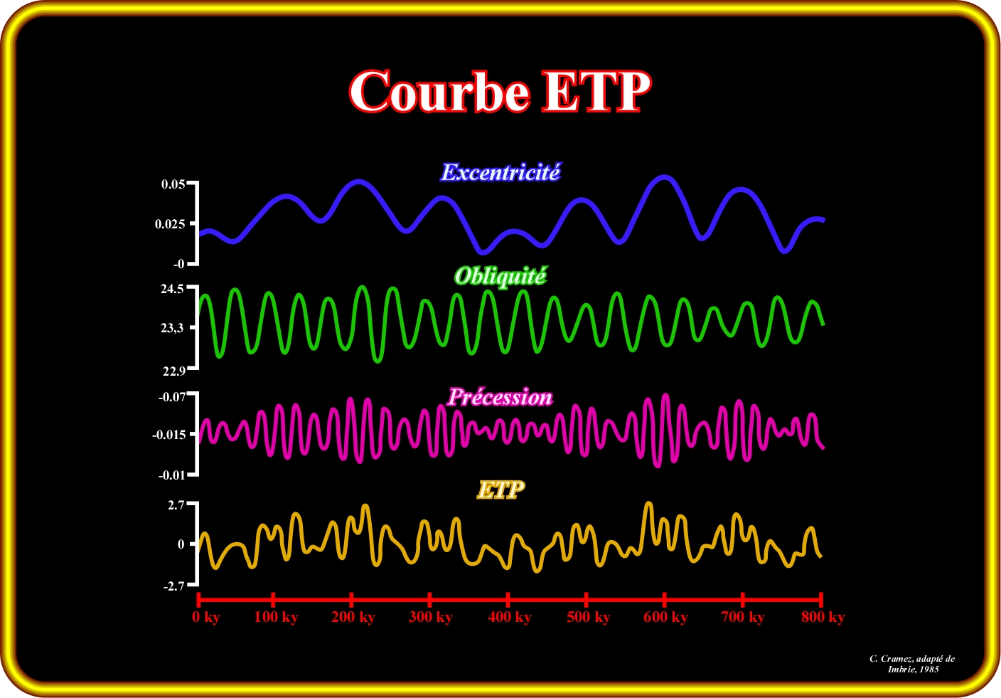 L'excentricité (forme de l'orbite terrestre autour du Soleil), l'obliquité (variation de l'inclinaison de l'axe de rotation de la Terre) ou la précession des équinoxes (mouvement rétrograde des points équinoxiaux une fois que l'axe de rotation de la Terre tourne comme une toupie) sont capables de provoquer des changements climatiques importantes. Par exemple, quand l'obliquité est faible (axe de rotation de la Terre presque normal à l'écliptique, c'est-à-dire, l'apparent trajet que le Soleil fait dans le ciel pendant un an), plus d'énergie est fournie dans l'équateur que dans les pôles, ce qui crée un fort gradient de température et moins de variations entre les stations. Les variations de la précession modifient la structure des cycles des stations, une fois qu'elles déplacent le périhélie le long de l'orbite terrestre, ce qui change la distance Terre-Soleil à chaque station et, donc, l'intensité de l'insolation. Comme tous les effets, associés à ces facteurs, ont des périodes différentes ils ne sont pas en phase. Milankovitch a montré (sans ordinateurs) les relations entre les différentes phases de ces effets. Comme illustré dans cette figure, les effets combinés de ces trois facteurs, à savoir : (i) Excentricité ; (ii) Obliquité et (iii) Précession, pour une latitude de 65° N, sont évidents dans la courbe ETP, dont l'échelle verticale est en unités déviation standard. Des travaux stratigraphiques récents et de géologie isotopiques (en particulier l'utilisation des teneurs des isotopes d'oxygène), corroborent l'existence d'une corrélation probable entre les courbes de température (et d'autres paramètres) et les courbes de Milankovitch, illustré ci-dessus, pour les derniers 0.8 Ma. N'oublions pas que la climatologie moderne, basée sur un grand nombre d'observations faites dans un court espace de temps, n'a pas la capacité d'étudier les changements climatiques. Au contraire, la paléoclimatologie a ce pouvoir, mais malheureusement, à partir d'un nombre limité d'observations. Ainsi, il ne faut pas confondre le temps (climat) et les changements climatique, comme le font régulièrement certains «nouveaux» écologistes.